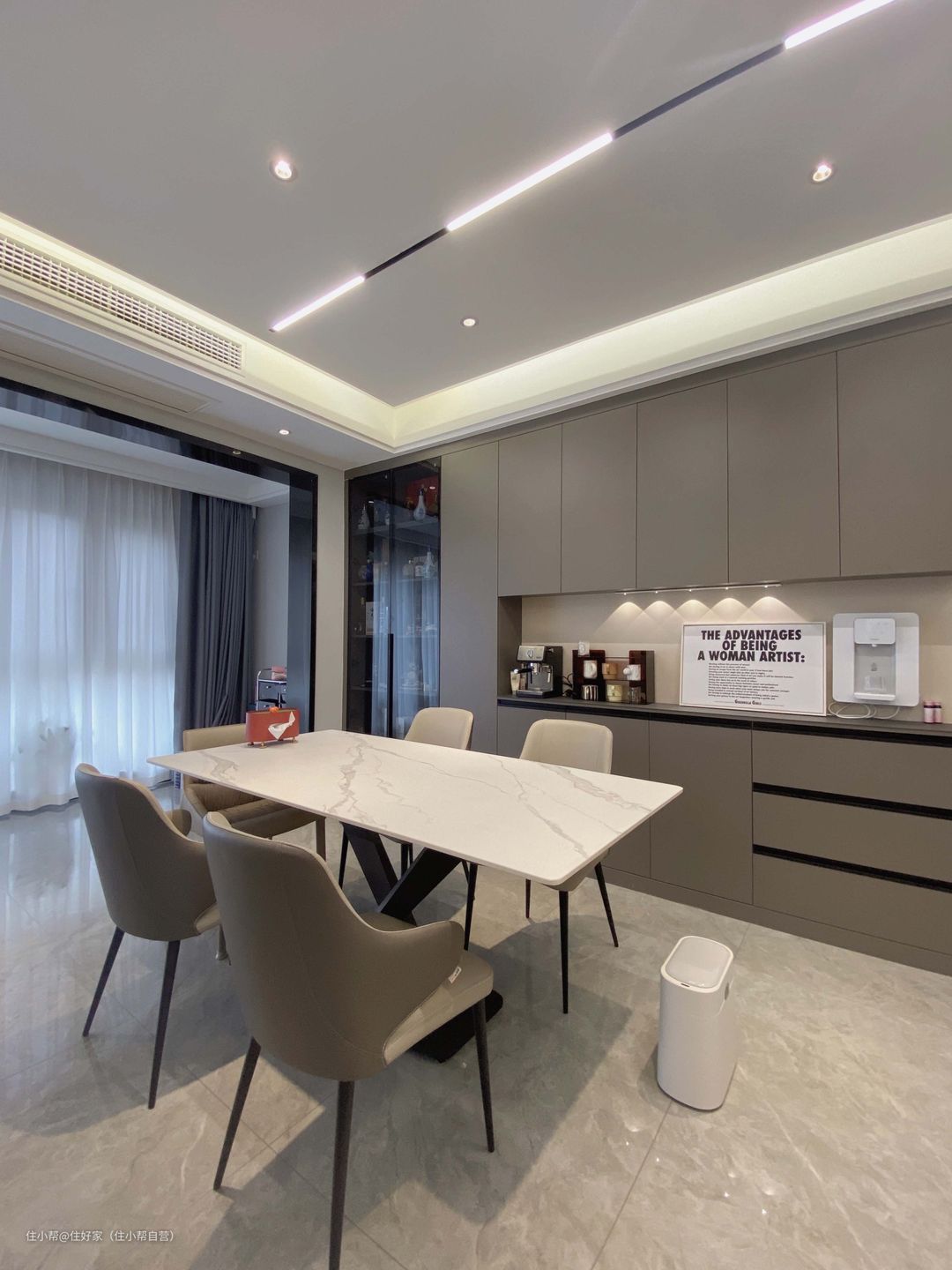 餐边柜也是全屋定制的,黑木卡其色,自然光下带一点点棕色,质感独特。 长3.45m,高2.52m,总深度320mm, 整体容量很大,左边可以做酒柜,造型别致,易于打理。 开放格长2.1m,高600mm,深度35mm, 可以摆放咖啡机或其他小家电,又是咖啡角,又是操作台,超实用。 贴上小山丘感应灯,精致又浪漫。