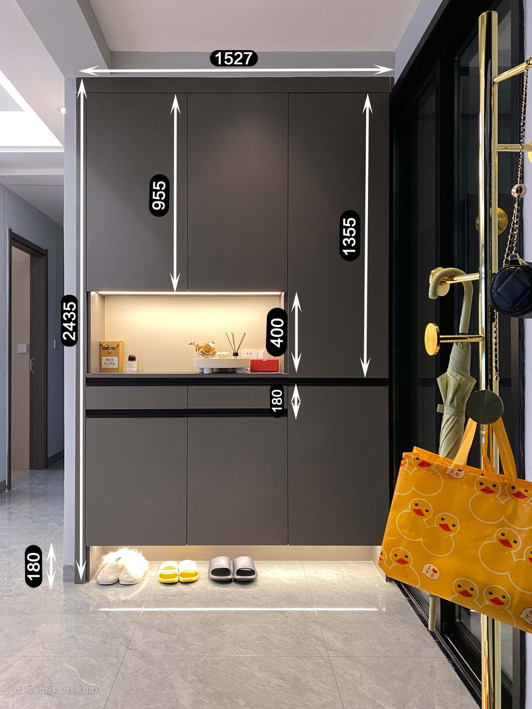 玄关是全屋定制的鞋柜,颜色是黑木卡其,搭配黑色L型拉手,简约高级。 开放格可以放置钥匙、包包等,嵌入了灯带,不仅使用方便,空间格调也大大提升。 底部悬空,可以放置平常穿的鞋子,扫地机器人打扫也很便捷。