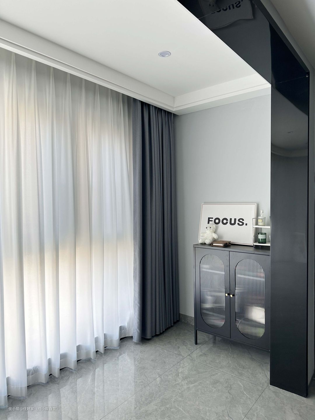 阳台舍弃了推拉门,做了不锈钢垭口,视觉上给房间带来了更大的空间感。 与客厅一体,大玻璃落地窗,通透明亮。 纯灰色系窗帘,柔抛的色泽很有质感,做了两倍韩式褶皱,离地2cm刚刚好。