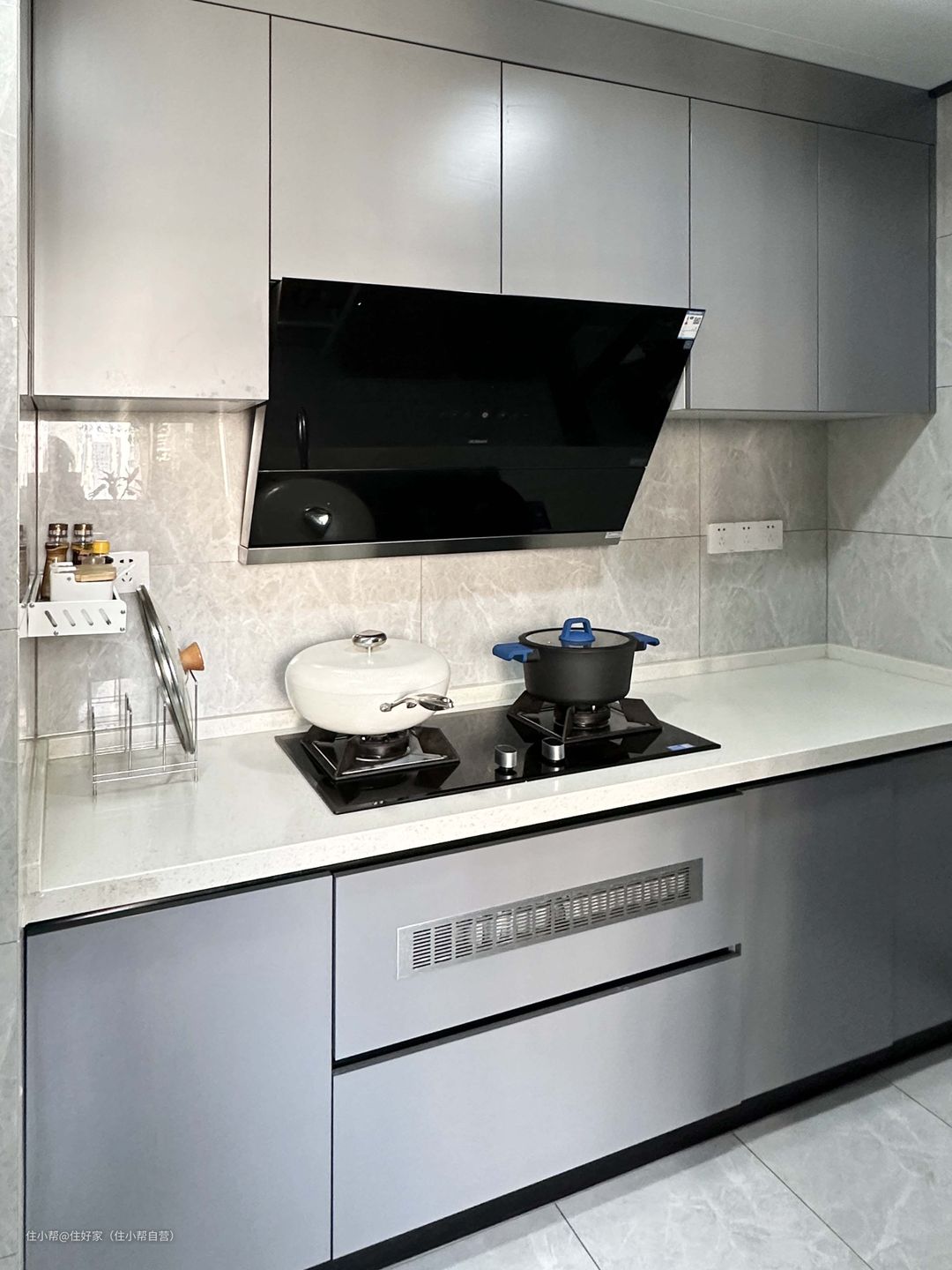 左侧地柜嵌入松下洗碗机,充分利用空间,功能性高,可以缓解家务疲劳。 墙面预留了电点位,使用各种小家电也很方便。 烹饪区一侧做了壁挂置物架,可以放置调料,实用性强。