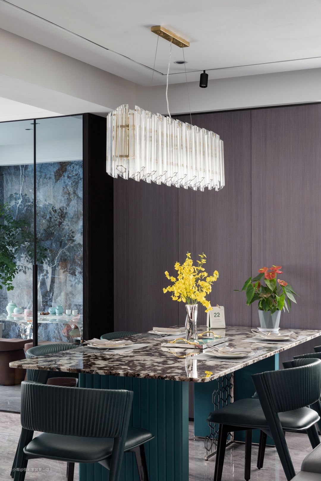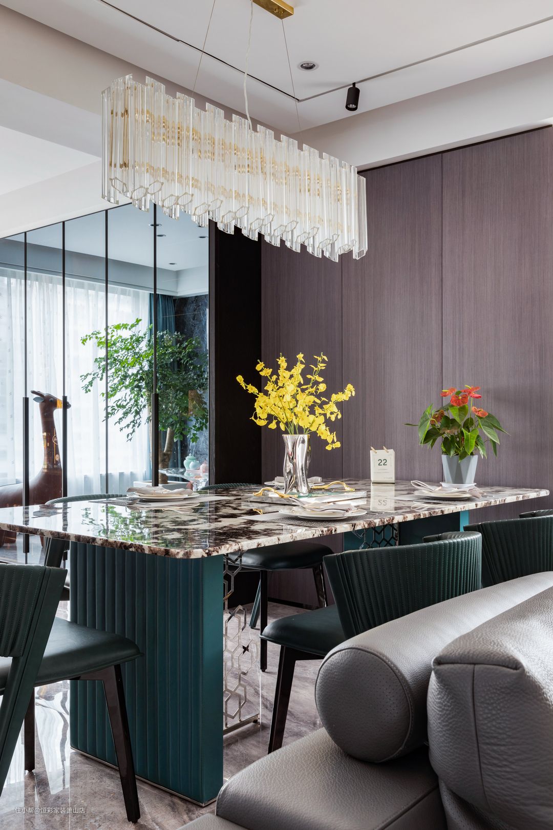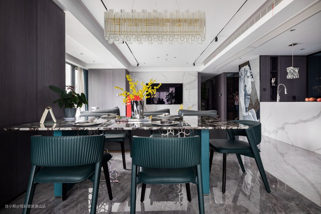 大理石纹理桌面张扬、随性,墨绿的实木支架足够稳定,配合同色系的餐椅,蕴含了别具品味的高奢气质,也代表了极致优雅的生活美学。