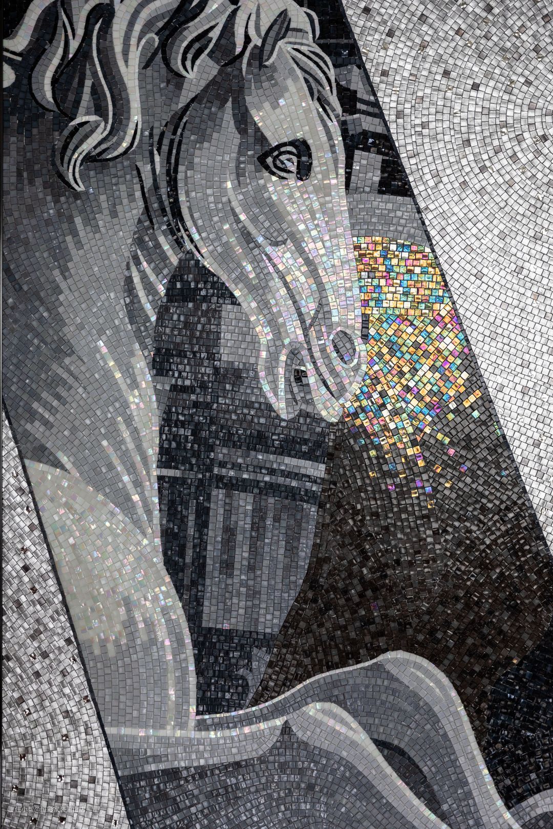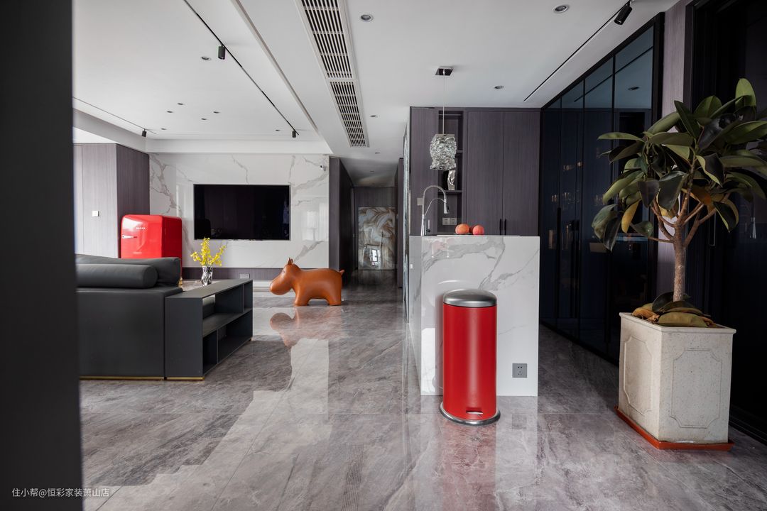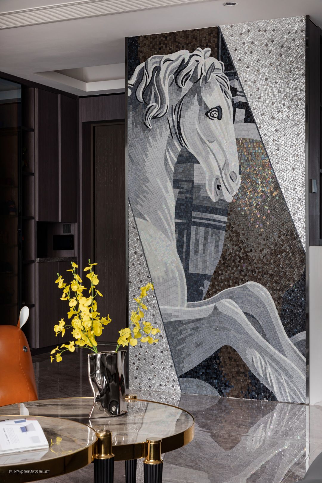 右边玄关柜将客卫内推,打一组深度约26cm的柜体,可用于鞋品收纳;左边则是用于衣物的悬挂,进深50公分。 由玄关而入,转角为整墙式马赛克艺术画,增加装饰效果的同时,也拉开了意式简约的轻奢格调。
