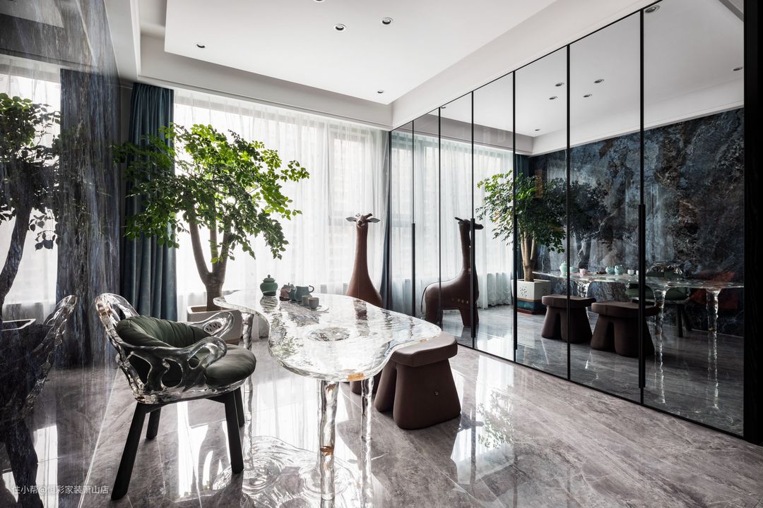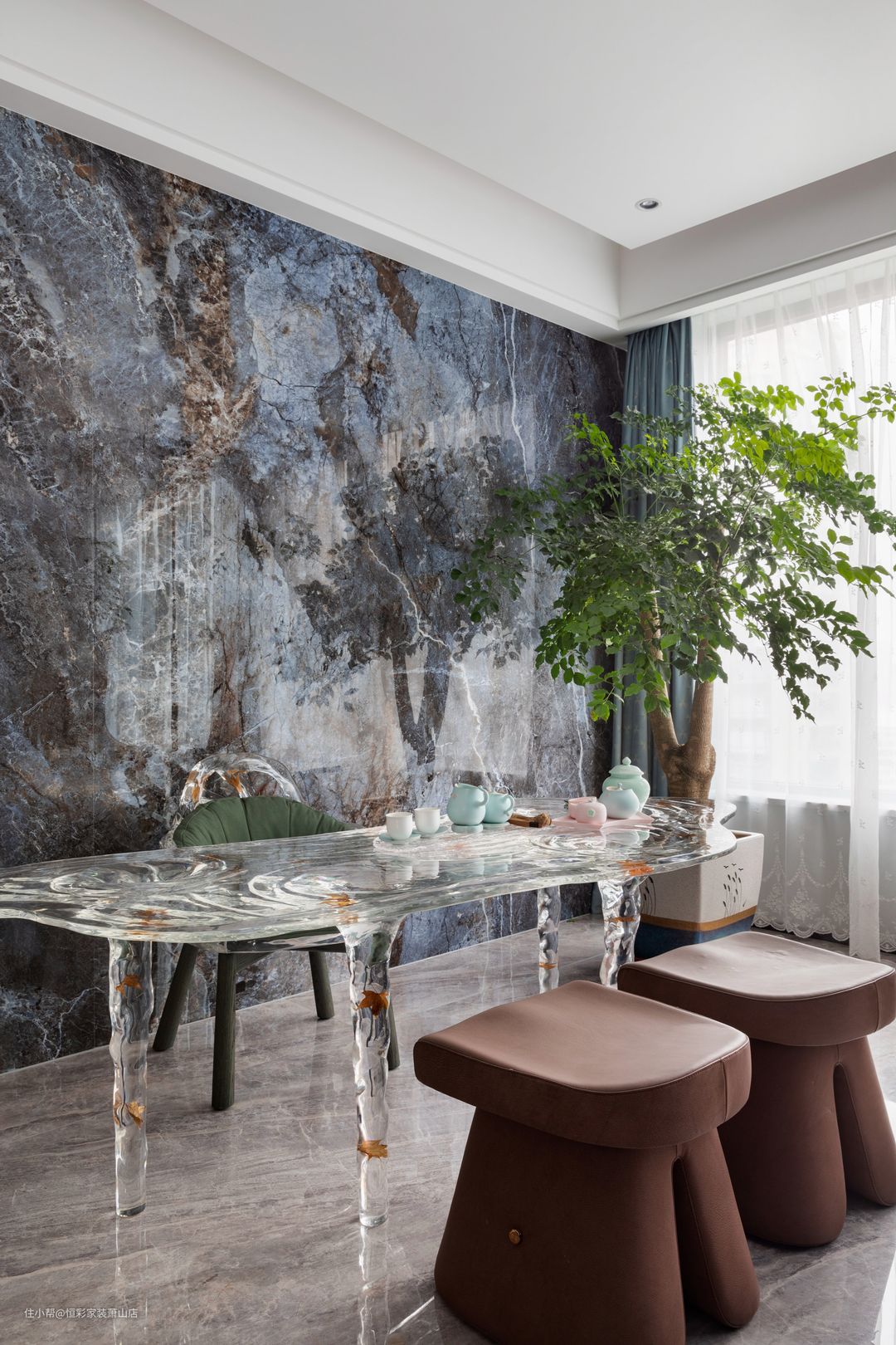 茶室的地板由客餐厅平铺,纹理自然,大气磅礴。铂晶树脂的茶桌椅,配合浓墨重彩的背景墙,满眼是自然背景下的肆意、畅快。
