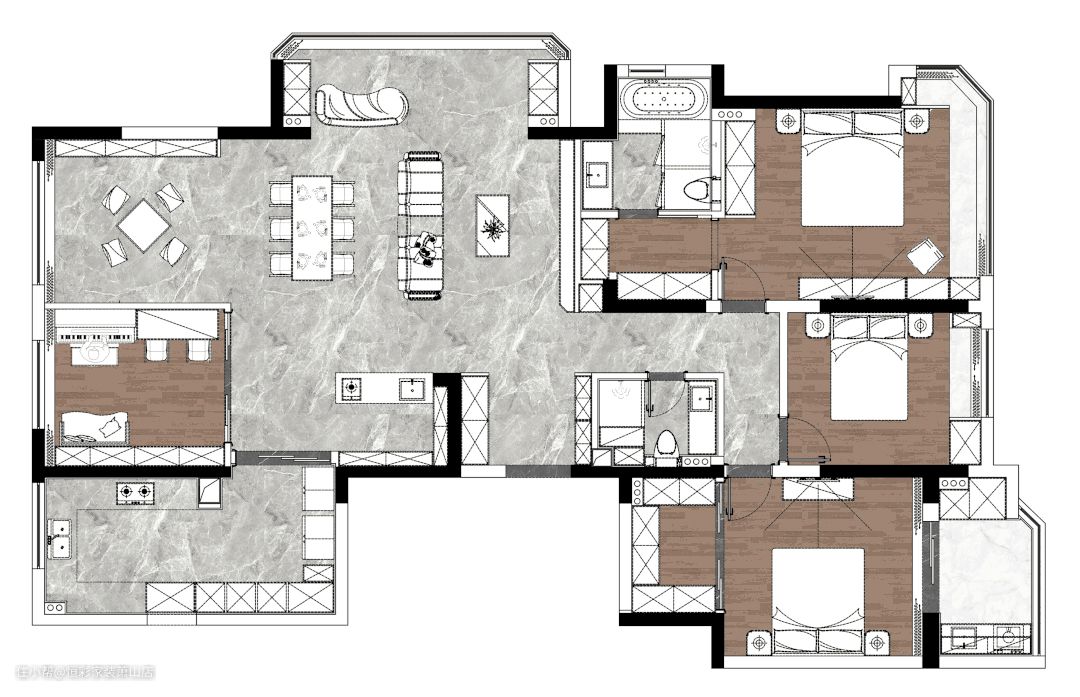 主卫虽分了一部分给主卧,但也向客厅偏移了些,从面积上来说并没有损失,但整体空间相对规整了。