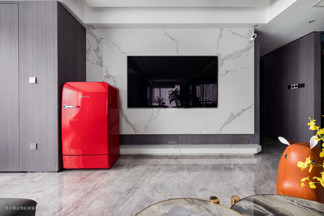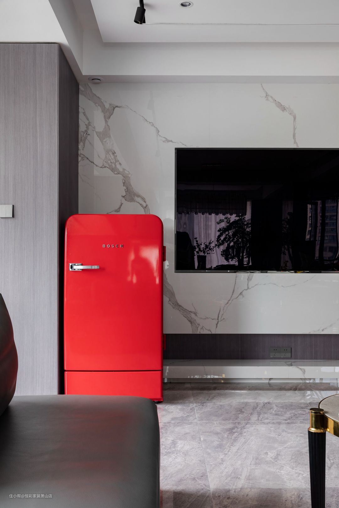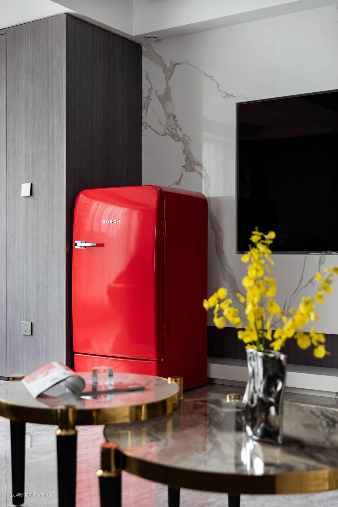 靠边摆放的BOSCH冰箱,造型复古,用色大胆,算是客厅非常“抓马”的色彩,也能小小地渲染周边氛围。
