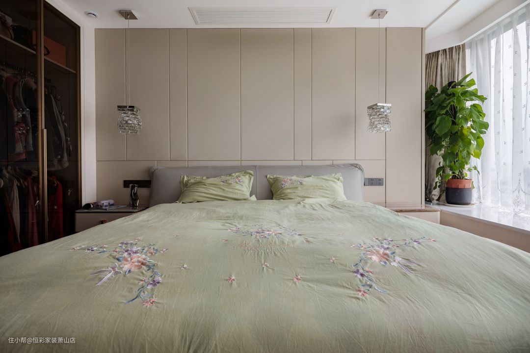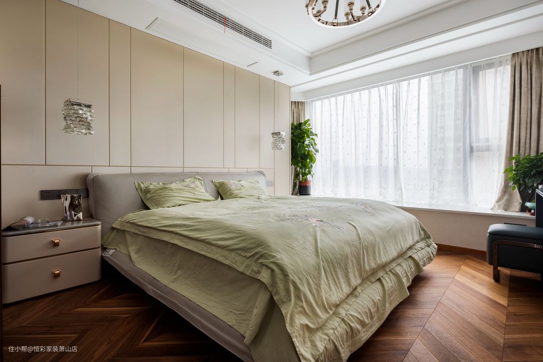 米黄色的硬包护墙,以线性带来视觉变化。床品是肉眼可及的舒适。木地板选择鱼骨铺贴,艺术加分。