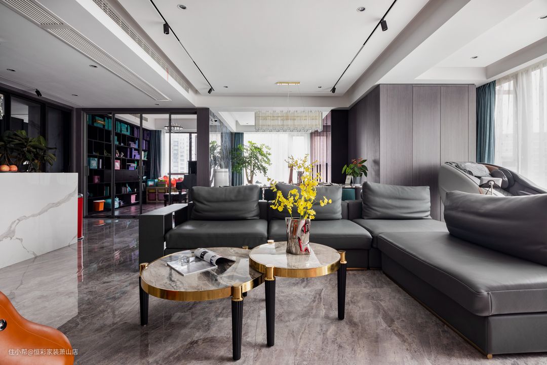 客厅的布置非常简单,一张L型沙发+组合圆几承担会客职能。沙发线条简洁,皮质坐感舒适,极简的造型,简约的色调无声表现出低饱和的奢华。茶几的金属元素,则将风格调性直接展露,黑金配色,大胆而高级。