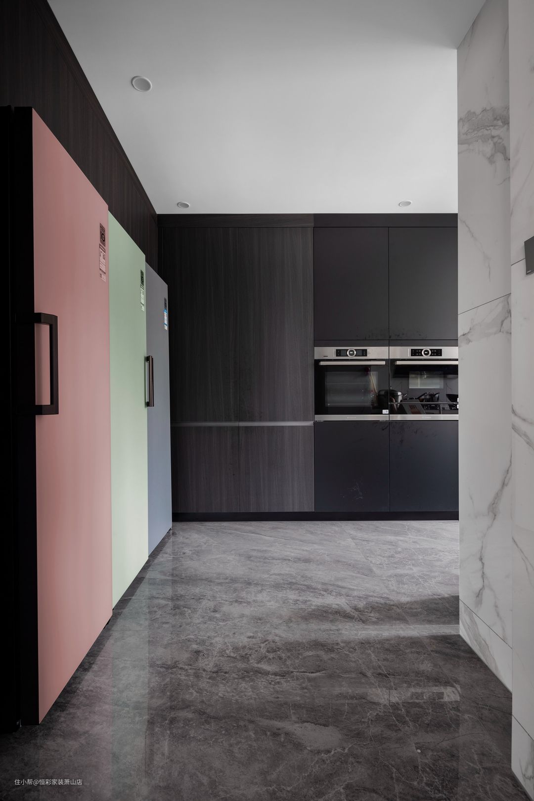 约15m²的厨房,进门靠墙依次放下两个双开的冰箱,并且留出足够的过道空间。