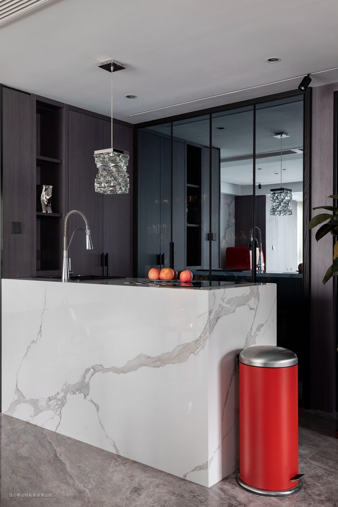 吧台与电视机背景墙材质相同,遥相应对。设计水槽+电磁炉,可满足简单的烹饪需求。 购自宜家的米约萨踏板式垃圾桶,也是与冰箱做了颜色的呼应,虽惹眼但也不会太突兀。