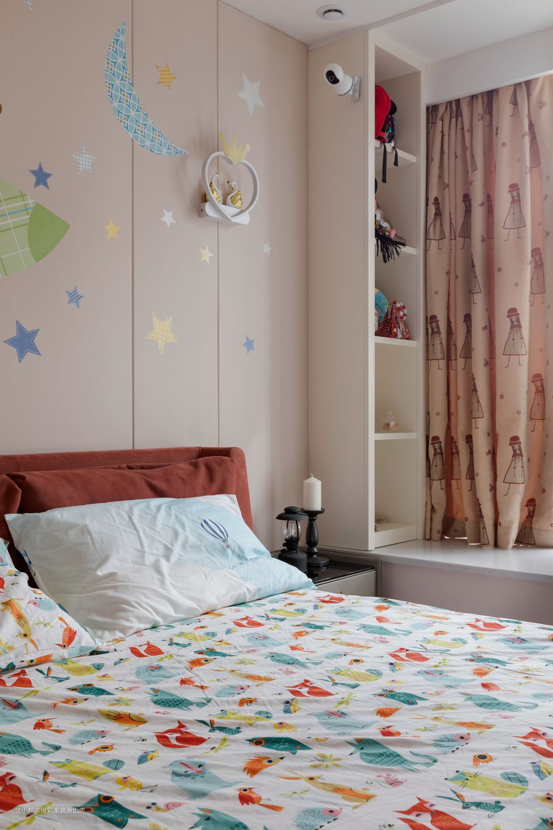 飘窗保留,靠墙做分层置物架,将窗边打造成了了一个休闲的区域。至于背景墙的布置,可爱的壁灯、卡通的贴纸当然是装饰的绝佳之选呀~