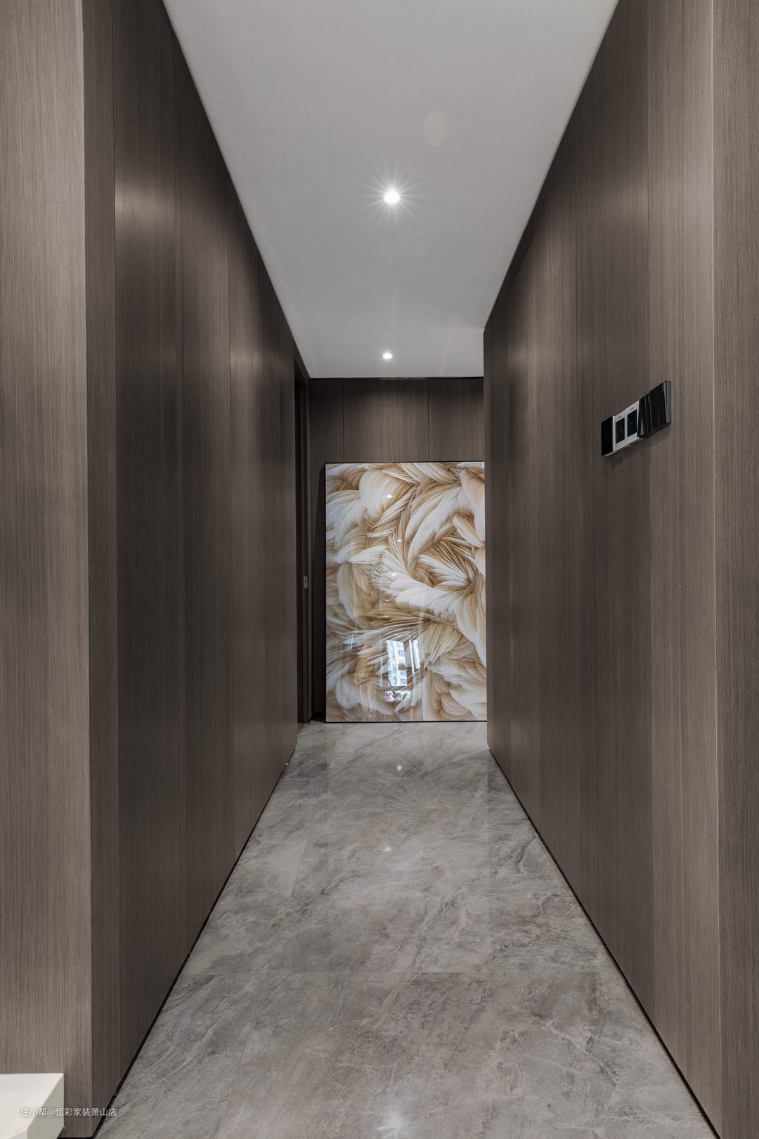 通往静区的过道,是以木饰面所构建的中性世界。客卫做了隐形门,保证了墙体的完整。尽头的装饰画,搭配深色的宁静,带来视觉惊喜。