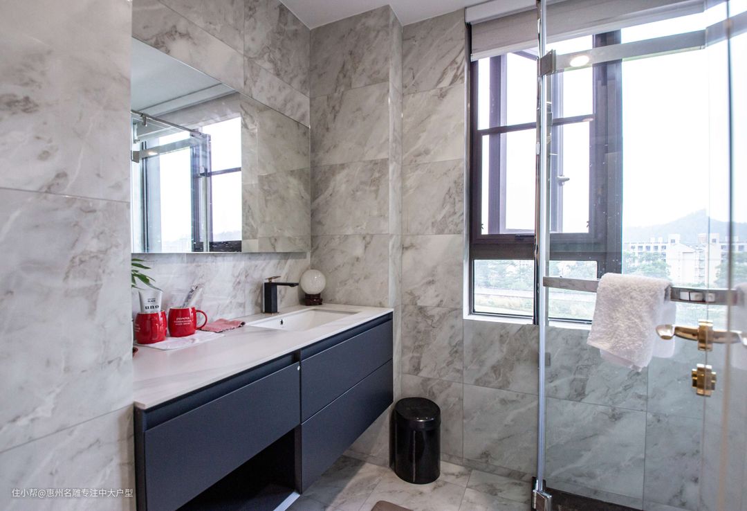 卫生间内整体布局大气而不显局促,整面透亮盥洗镜应用在主卫,搭配长型操作台,空间内多方位功能需求得到满足。台下盆设计保证实用性与美观度,下方中空区域满足多样的生活存储需求。淋浴区用玻璃隔断开来,保留了一扇窗户,增加采光和通透性。