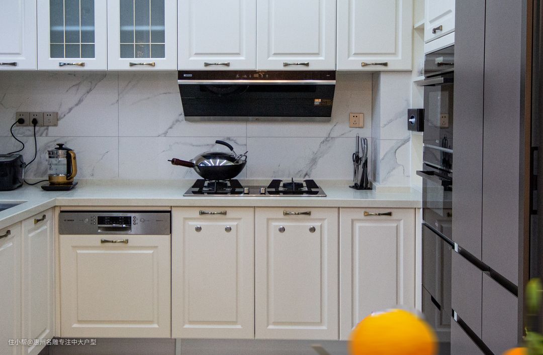 厨房线排般的灯光依次陈列,富余的光线渗透进入每一处至暗角落之中。一眼望尽仿佛空间皆由柜体排列而成,充足的空间位置满足厨房最为基本但也最为重要的收纳需求,空间内功能丰富,打造一处厨余生活多功能区。