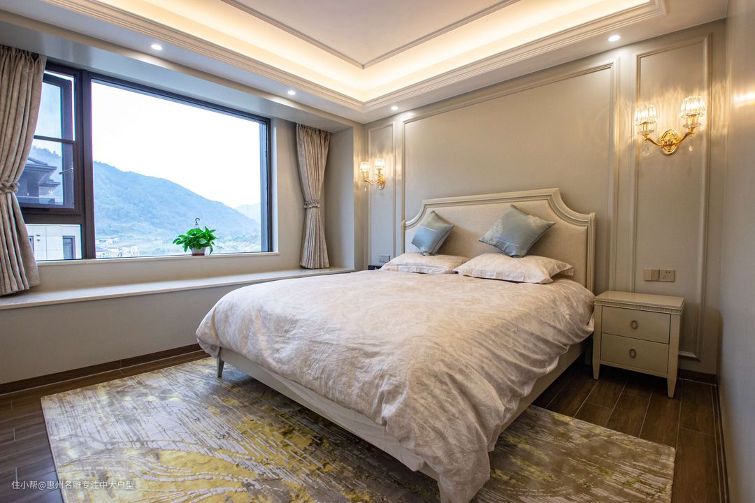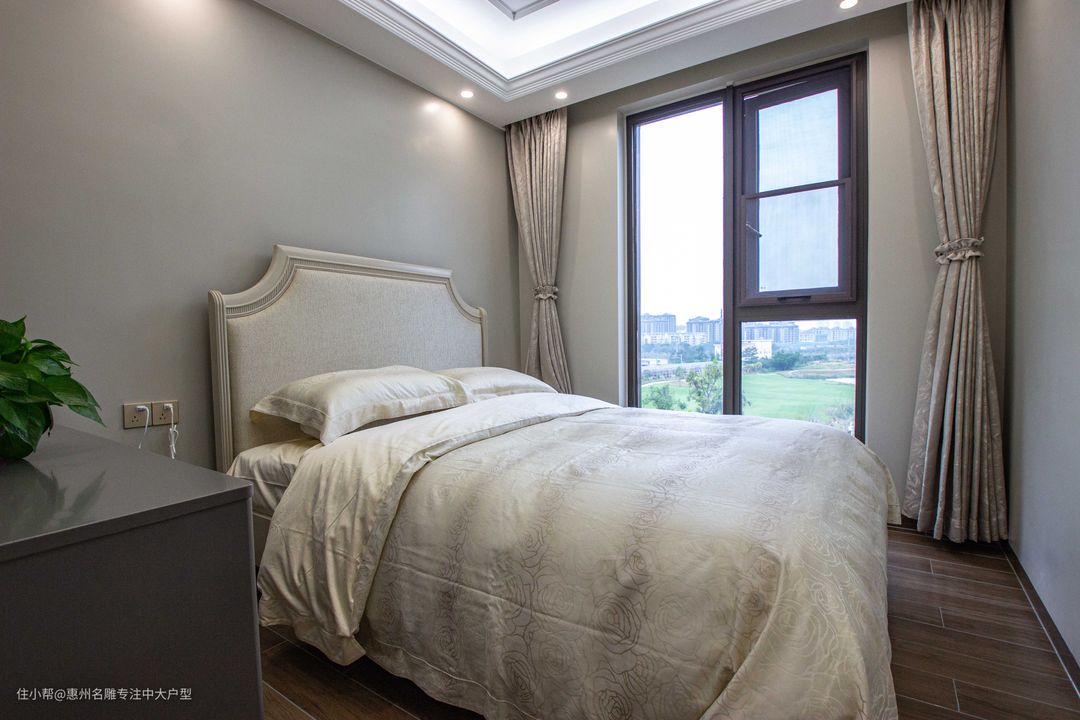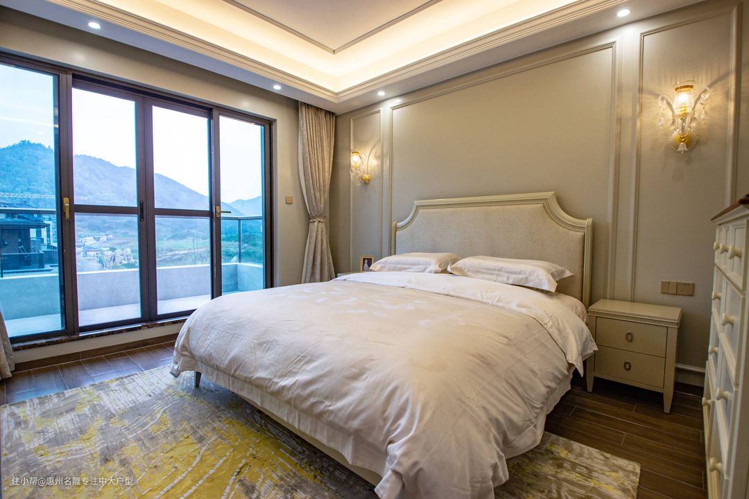 坐落在二楼的主卧拥有极佳的视野,因此设计师充分考虑到这一要素,在主卧增设一处整面推拉落地窗,尽览窗外风景。原木色地板呼应暖黄色喑哑灯光,呈现一副欧式中独有的田园意境,富有古典美的石膏线给人以开放、宽容的非凡气度。