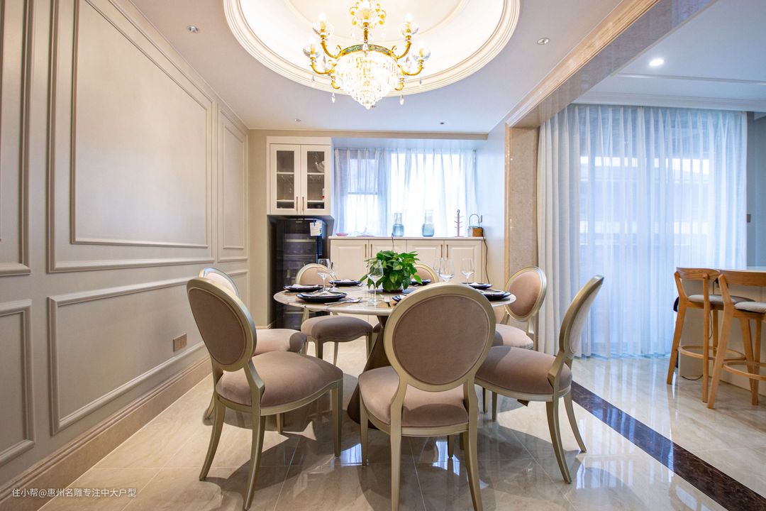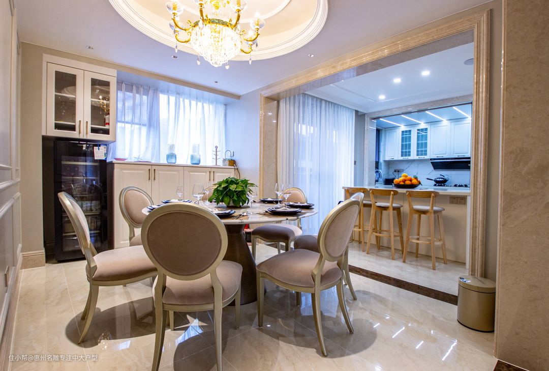 本案中,墙体流线饰面、水晶灯坠结合亮金色金属材质无不打造一场华丽贵气的空间体验,生活的仪式感浮于轻薄大理石桌面之上,沉于高脚玻璃杯之下、归于一刀一叉之间。餐厅极尽奢华,餐厅吧台增添一丝内敛之气,整体协调统一,满满的精致奢华感。