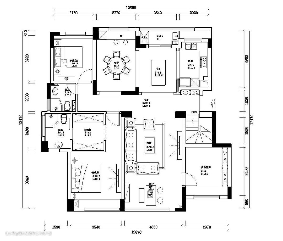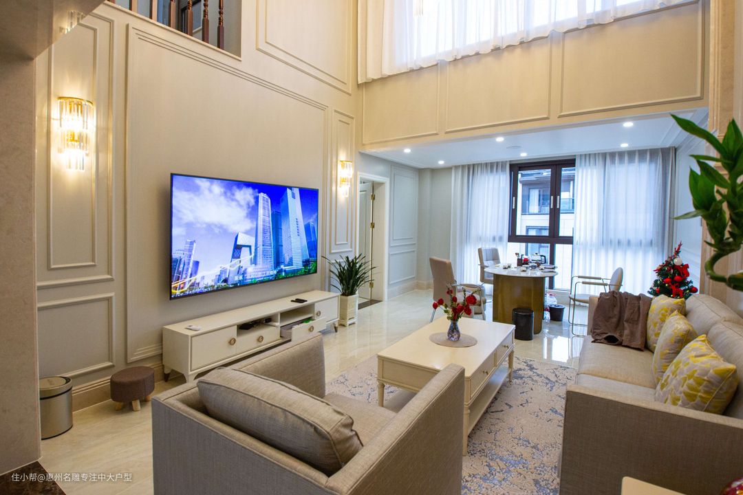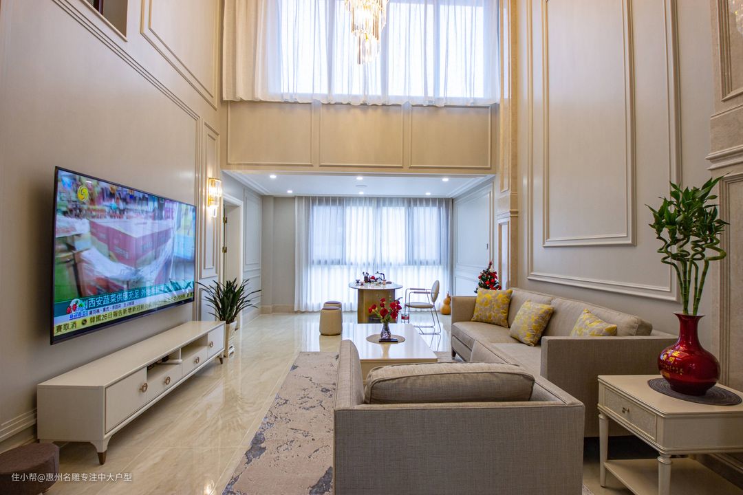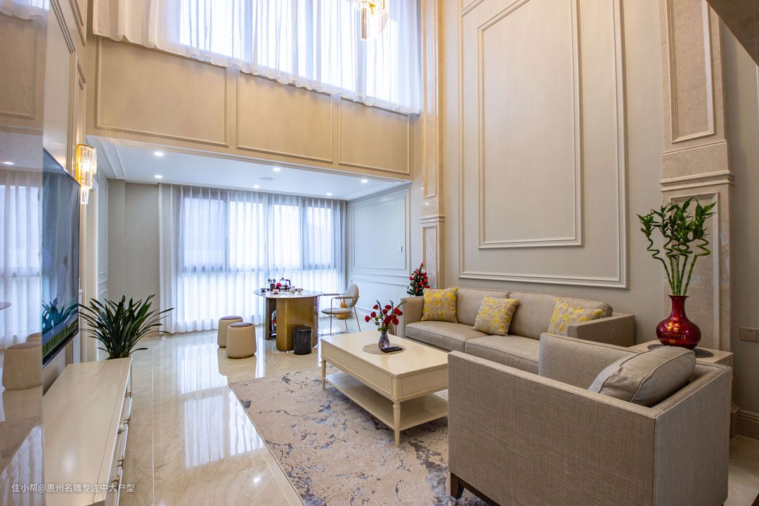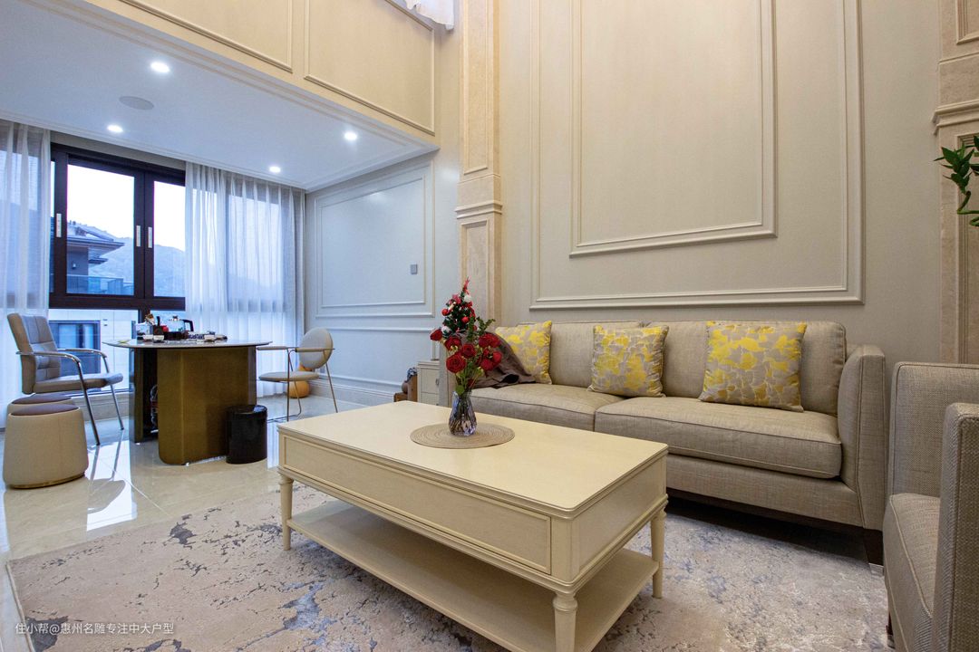 1.户型描述: ①本案例是两层的复式楼,业主喜欢奢华一点的装修风格,一楼客厅要做挑高设计,还规划了长辈房、儿童房、多功能房;二楼是主卧,带衣帽间、卫生间、阳台,两夫妻可以过浪漫的二人世界。 ②茶厅原本毗邻于客厅,并由一堵装有滑轨的墙体阻隔,布局优化后撤销该墙体,使得客厅视觉范畴得到进一步提升。同样,二楼原本杂物间被拆除,其空间融汇进观景阳台中。 2.设计理念: ①设计师期盼用一种 “舒畅身心”的方式为业主开启宁静闲适的家居生活,因此,本案空间摒弃了繁杂的动线格局,在视觉范畴上感受更为宽阔大气的布局,并采用更为明亮但不艳丽的色系铺垫,凸显生活智慧。