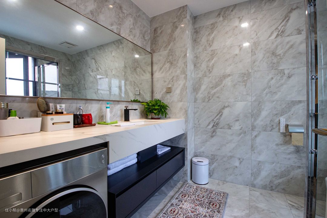 卫生间内整体布局大气而不显局促,整面透亮盥洗镜应用在主卫,搭配长型操作台,空间内多方位功能需求得到满足。台下盆设计保证实用性与美观度,下方中空区域满足多样的生活存储需求。淋浴区用玻璃隔断开来,保留了一扇窗户,增加采光和通透性。