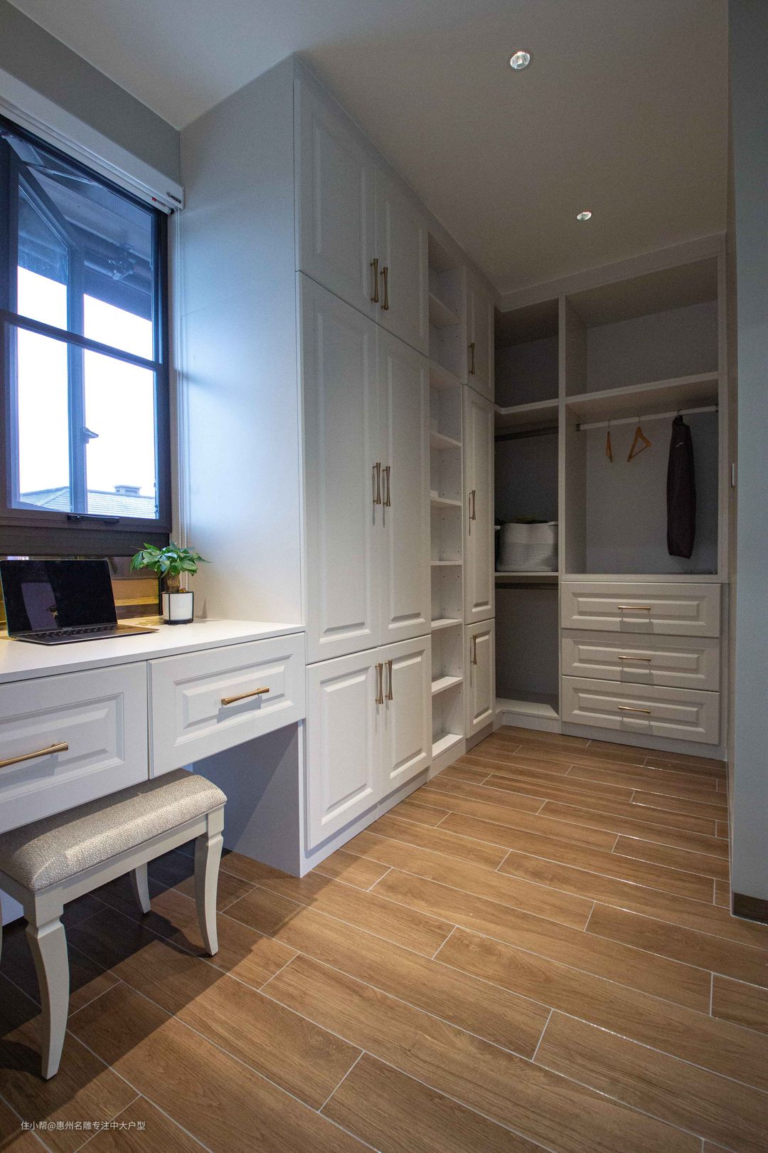 主卧衣帽间延续整屋的风格特点,木质地板、流线饰面装饰柜体,洁白之间凸显恢弘大气,搭配奢金色金属柄杆,由此可见空间内蕴含欧式奢华的底蕴但更为彰显现代人从简从易的生活理念。聚焦式光源专注展示功能,空间内营造整体宁静惬意的氛围后,衣帽间亦可作为办公区。
