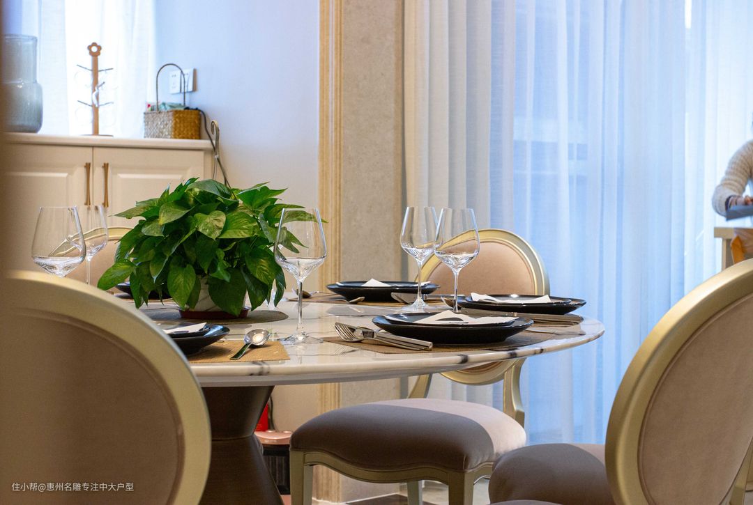 餐厅背景同样采用了对城的设计方式,顶天立地的餐边柜,让收纳空间更充足。