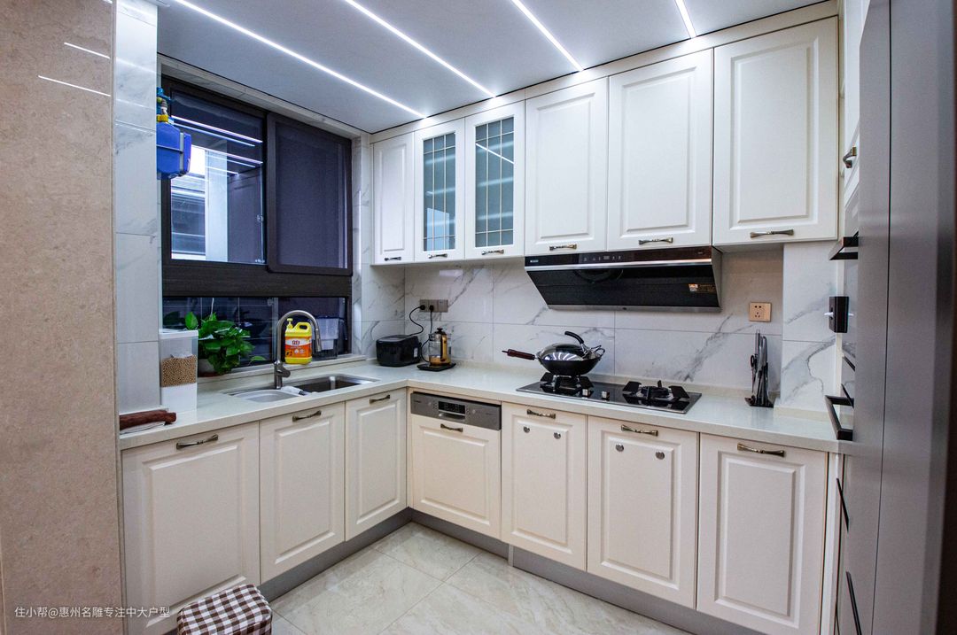 厨房线排般的灯光依次陈列,富余的光线渗透进入每一处至暗角落之中。一眼望尽仿佛空间皆由柜体排列而成,充足的空间位置满足厨房最为基本但也最为重要的收纳需求,空间内功能丰富,打造一处厨余生活多功能区。