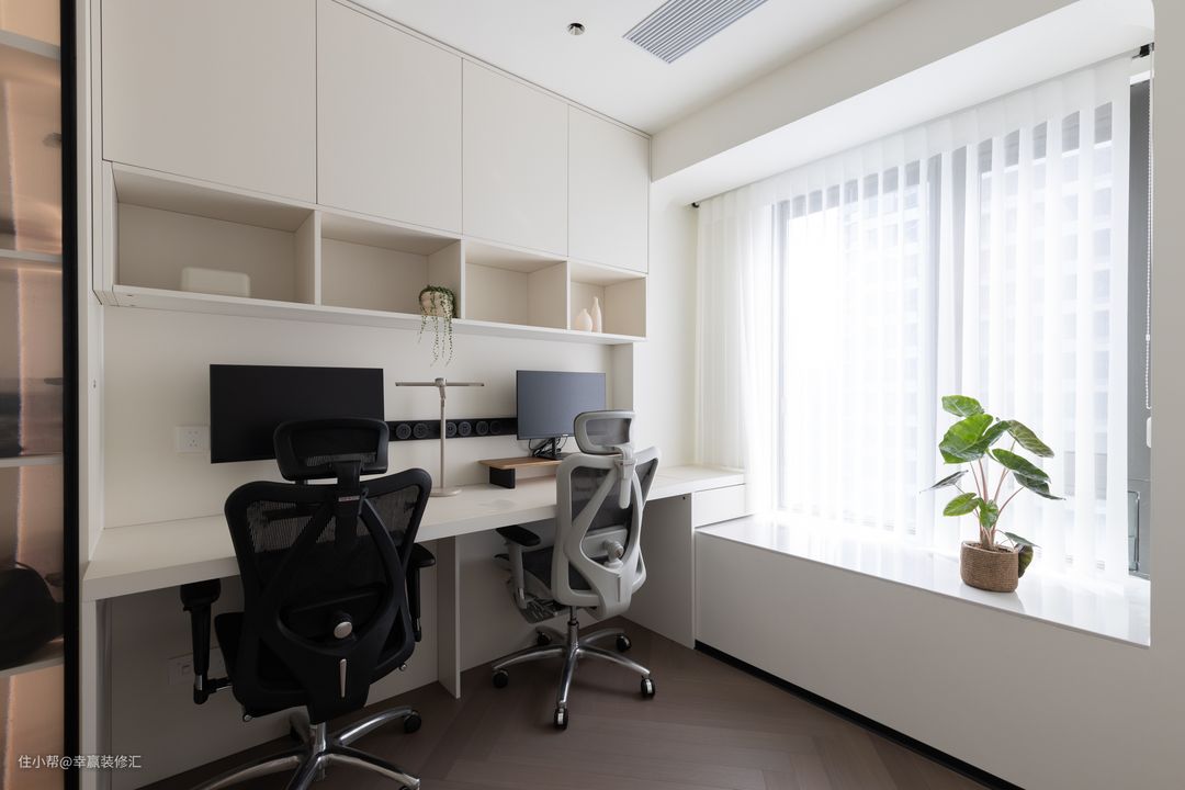 设计师利用书房墙面空间定制了吊柜书桌,充足的收纳空间和宜人的光照都恰如其分,让整个区域实现工作或学习的聚焦属性。书柜门采用高颜值的长虹玻璃设计,自带朦胧美感,透光不透视,完美实现光线与隐私的共存。