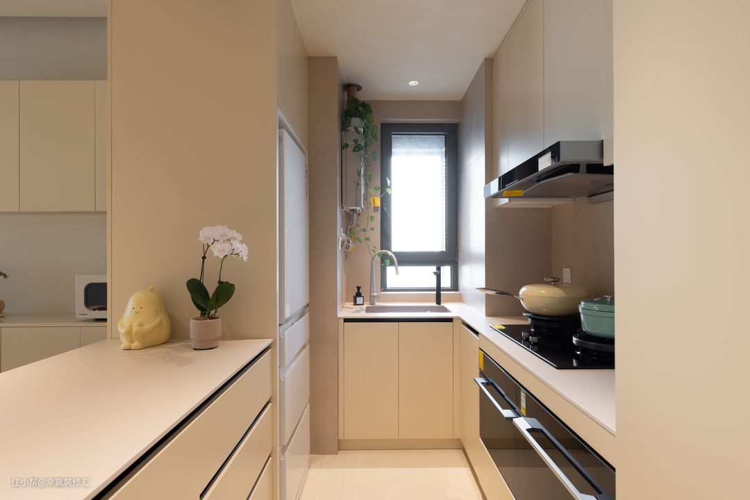 设计师在厨房操作台的对面设计了通顶柜,做为厨房储物补充,中间嵌入的冰箱和一旁吧台,让操作动线流畅自如。