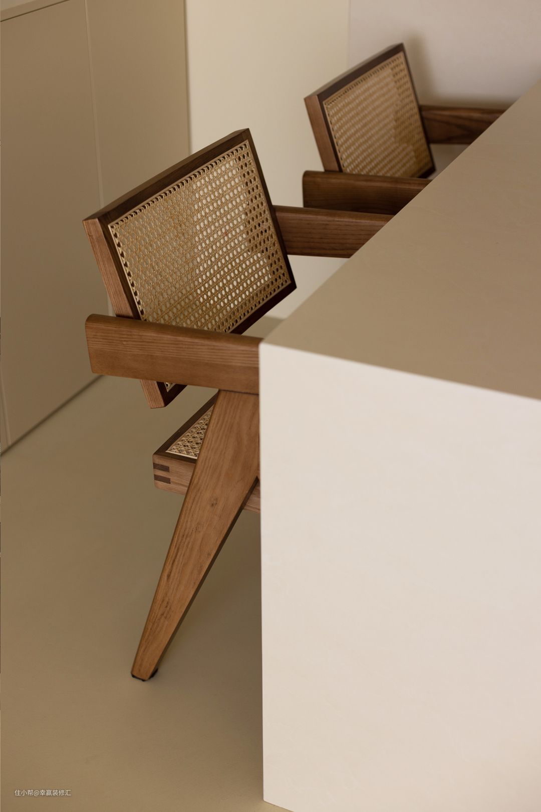 为保证设计的整体性,设计师在餐厅选用了同色系的奶油+木色元素,让视觉保持一致。有着藤编元素的餐椅与大理石餐桌组合成对,线条流畅,淡雅匀润,复古美感油然而生。