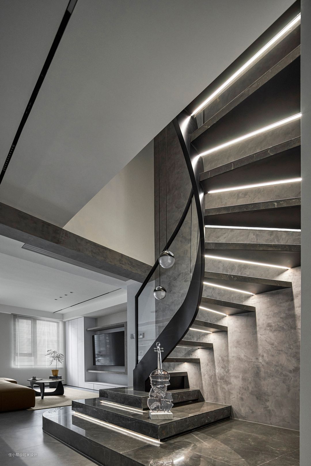 半旋转式的楼梯,搭配运用石材、玻璃、钢架,线条利落、简约大气。拾步而上,视觉上的轻盈与脚下的实感交汇。楼梯曲线柔和流畅,配合从二层落下的圆球吊线灯,提升空间层次感的同时也显得格外亮眼,视觉体验感拉满。悬空式台阶错落有致,减少视觉遮挡,踏步之下隐藏线性灯,隐隐漏出的光线,营造出明暗层次、虚实对比的视觉感,为空间增添几分空灵与趣味。