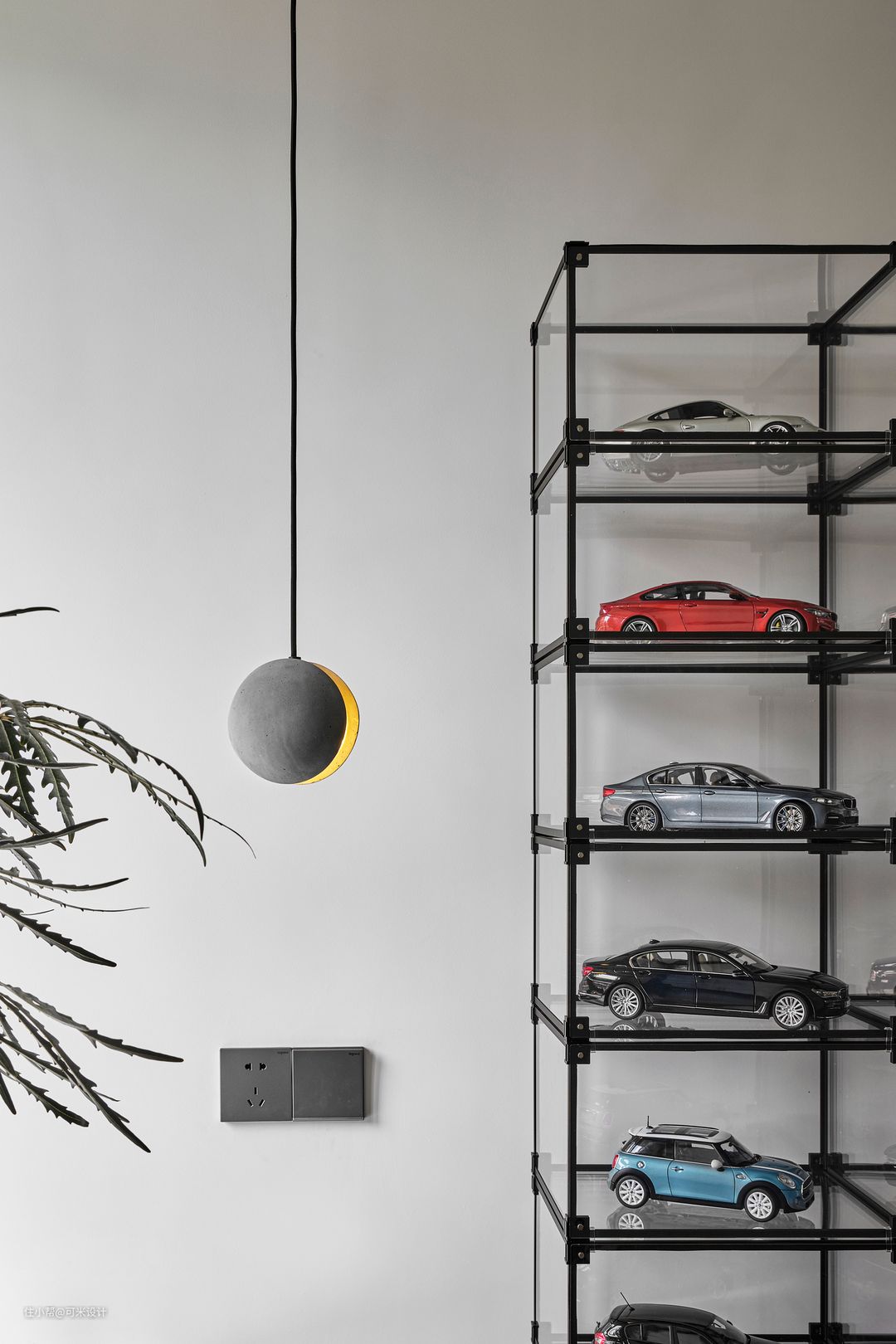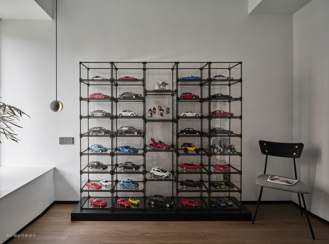 二层朝北的次卧作为活动室,男屋主喜爱收藏车模,购置开放式展示架,将各种模型收纳于此。