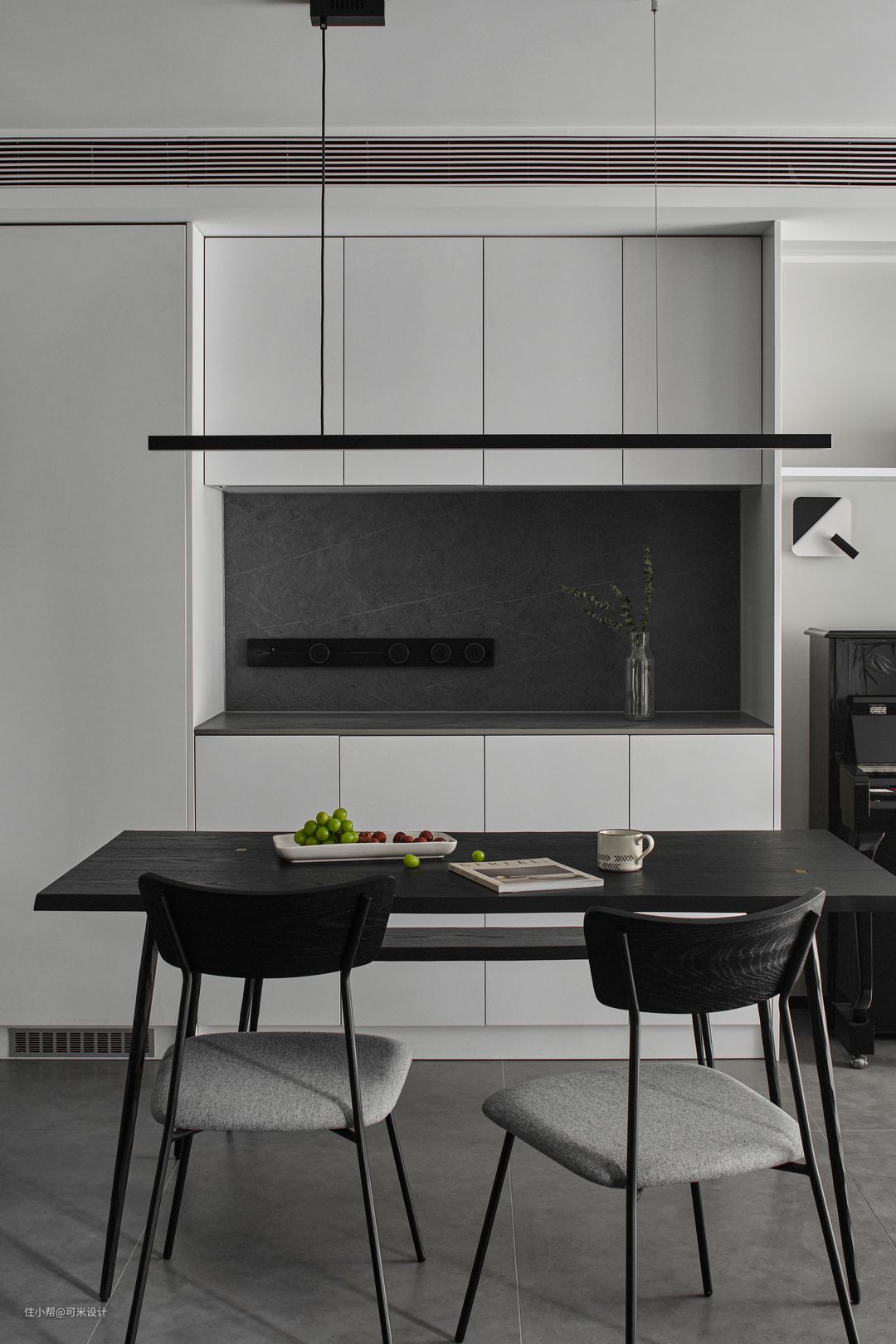 餐厅购置黑色的一字吊灯,简单的几何外形,给简约的空间增加了空间的层次美。长方形餐桌+2把餐椅+条凳的组合方式,将美感与实用完美结合,干净舒适的线条遇上高级黑,勾勒出简约的自然格调。