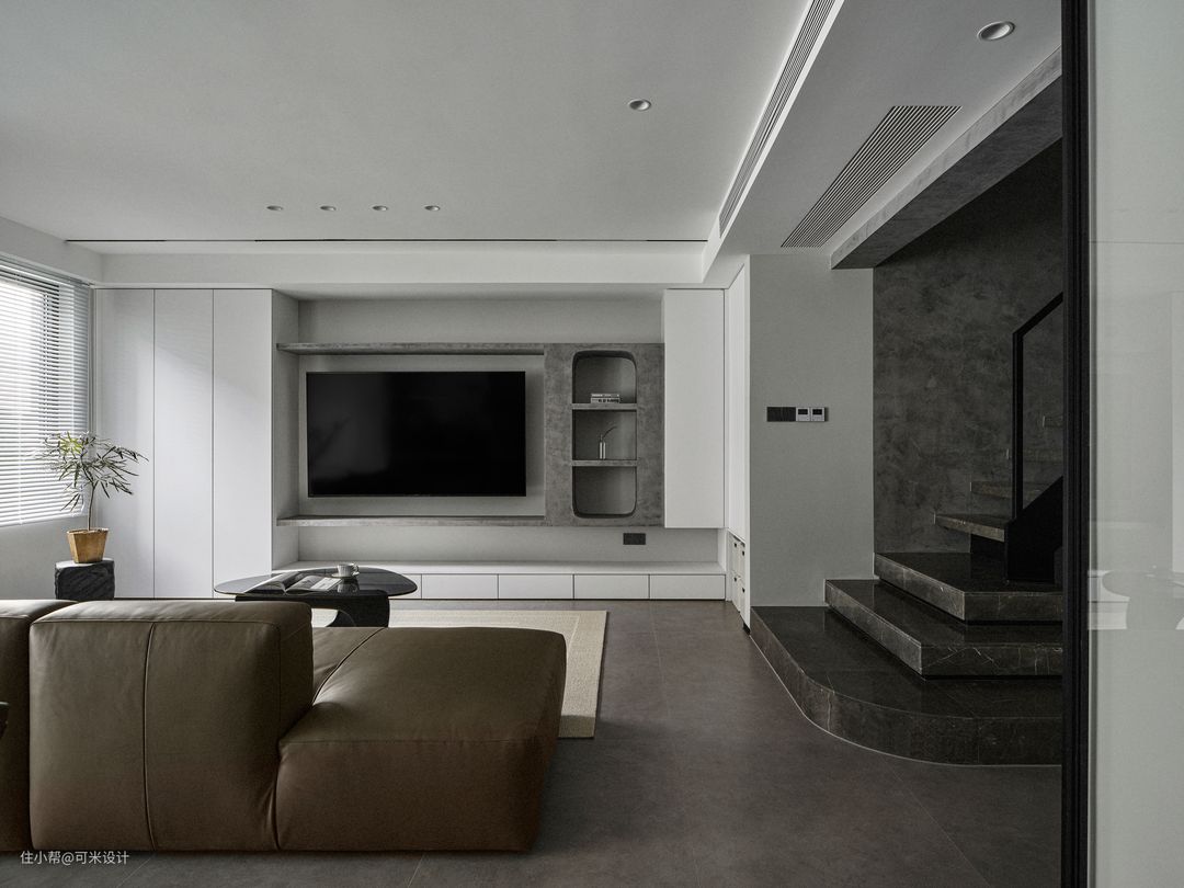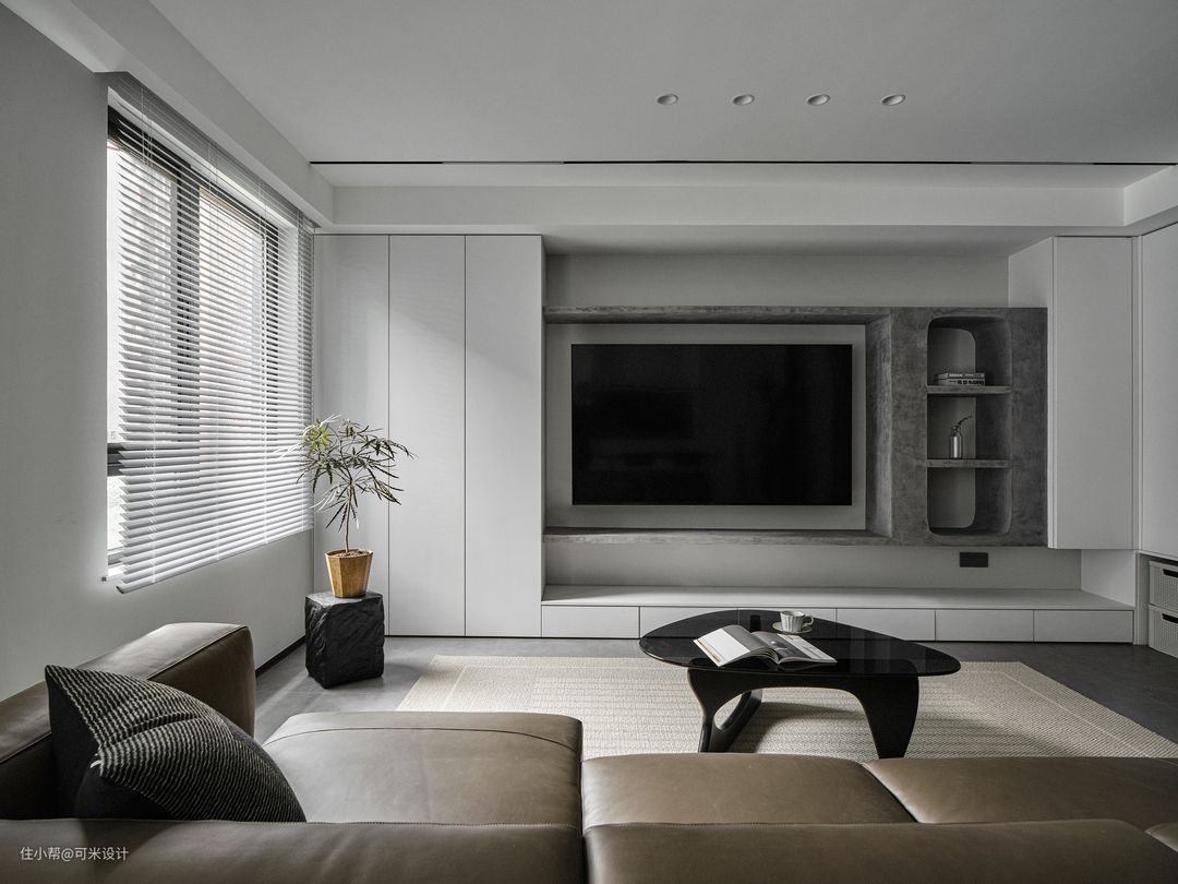电视背景墙采用隐藏式柜体+展示+电视的组合搭配,可以让整面墙看起来更整齐划一,更显品味。在封闭式的柜子内可以存放一些比较散乱的东西,用马来漆涂刷打造的开放格,让整个墙面更具层次感与高级感,圆弧的边角处理也增加了空间的设计美感,在其中摆放装饰品、书籍等,彰显独特的艺术品味。大面积的白色隐形柜体,更加简洁大气,给人一种纯净、舒适的感受;底部电视柜上方做镂空,适当的开放式展示架增添了空间的层次感和轻盈感,带来一种灵活多变的空间效果。