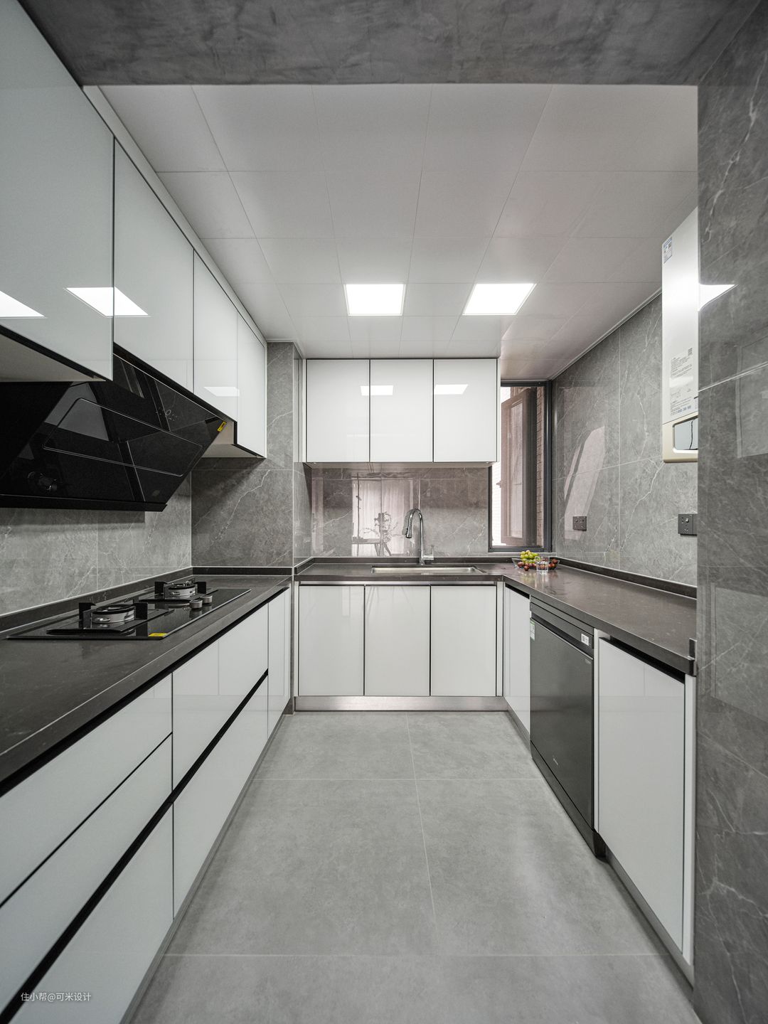 厨房通过扩大改造,内部的空间利用率有了极大地提高。敞亮的U型厨房,烹饪、备餐、清洗都有着各自独立的区域,让烹调更加安全快捷。以灰色墙地面作为基础,深灰色石英石作为台面,整体橱柜定制超白玻璃柜门,方便日常清洁打扫,在简约的基础上营造出空间的光泽感,整体更加明亮、整洁。