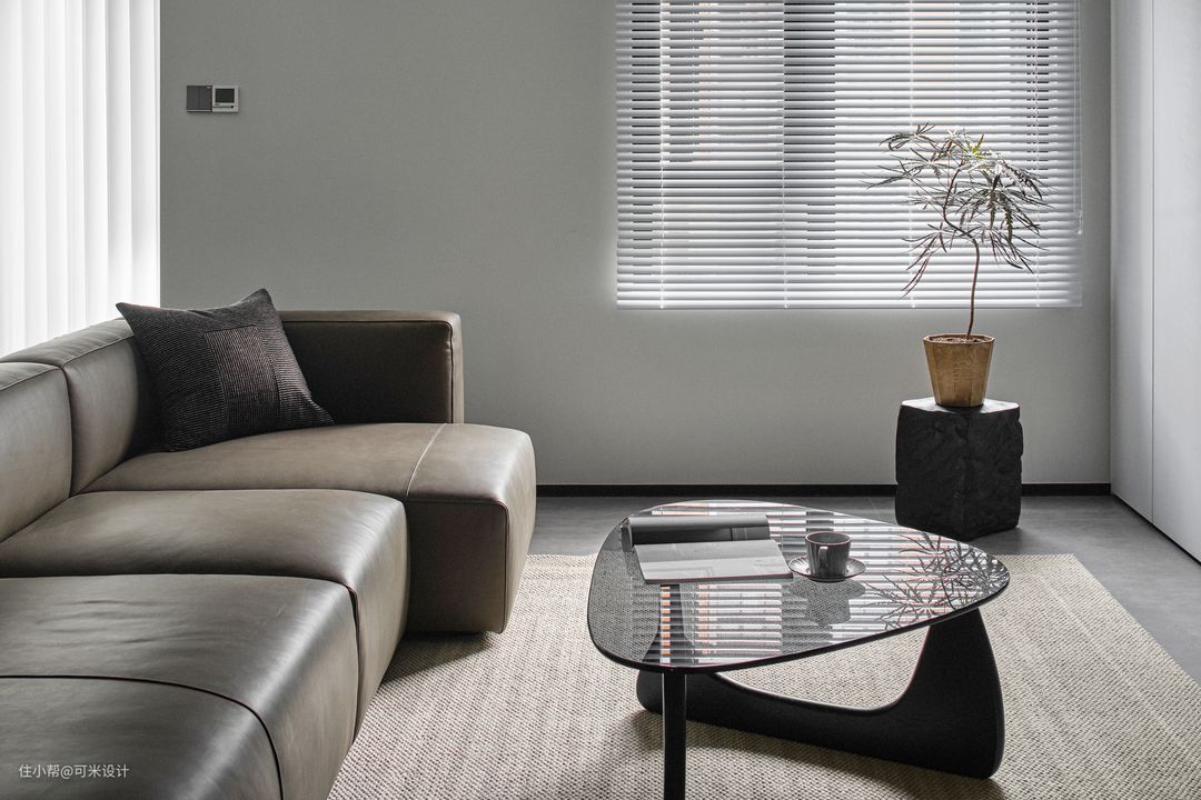 客厅一侧的窗户安装了百叶帘,外观简洁大方,不影响旁边空间的使用,可以灵活控制光线进入室内,营造出斑驳的光线效果,既能保障室内的采光,又保证了空间的私密性,带来独特优雅的格调感,让空间显得大气美观。地面铺上一块驼色的剑麻地毯,自带沉稳气质,表面凹凸有着些许粗糙感,居家踩着袜子在上面有轻微摩擦的感觉,仿佛给足底做了一次按摩,轻轻柔柔却有着实实在在的一次大自然触碰,给人一种静谧、平和的感觉。