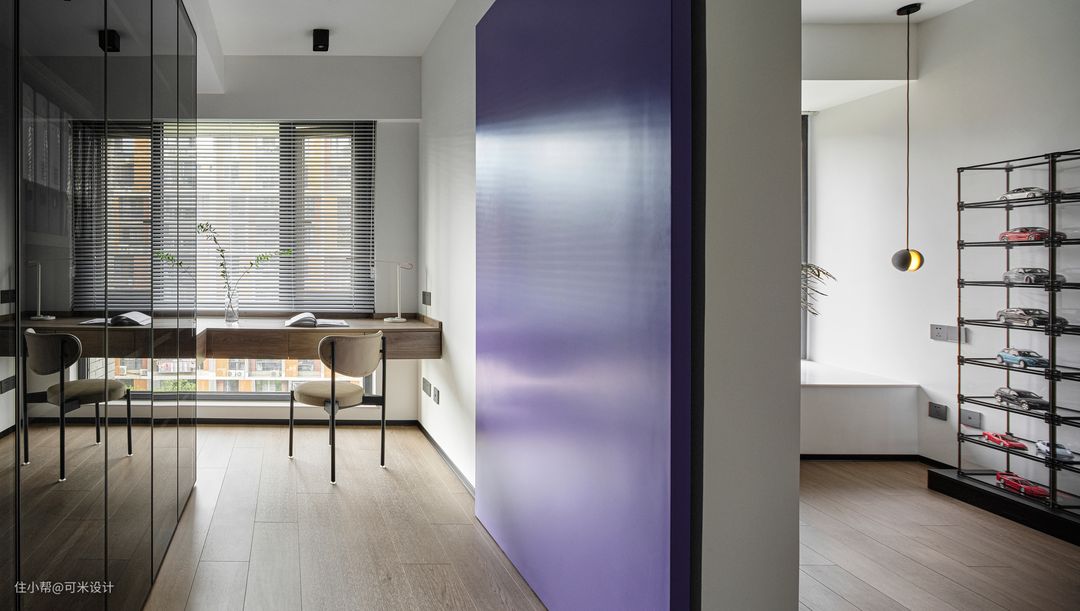 从活动室方可进入书房,打造一间安谧之所,两个空间以紫色的木质推拉门相隔,与娱乐室的紫色背景墙相呼应,在清澈淡雅的空间中增添一份明媚浪漫。沿墙定制一排顶天立地的书柜,采用黑色的玻璃柜门,增加收纳的同时又带来的高级感。