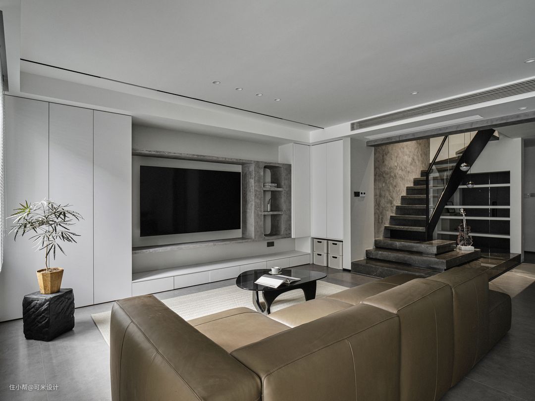 顶天的白色储物柜作为电视背景墙的延伸,下面做镂空,放置储物筐,收纳常用的零碎小物件,为空间注入一份轻盈感,过渡客厅和楼梯。