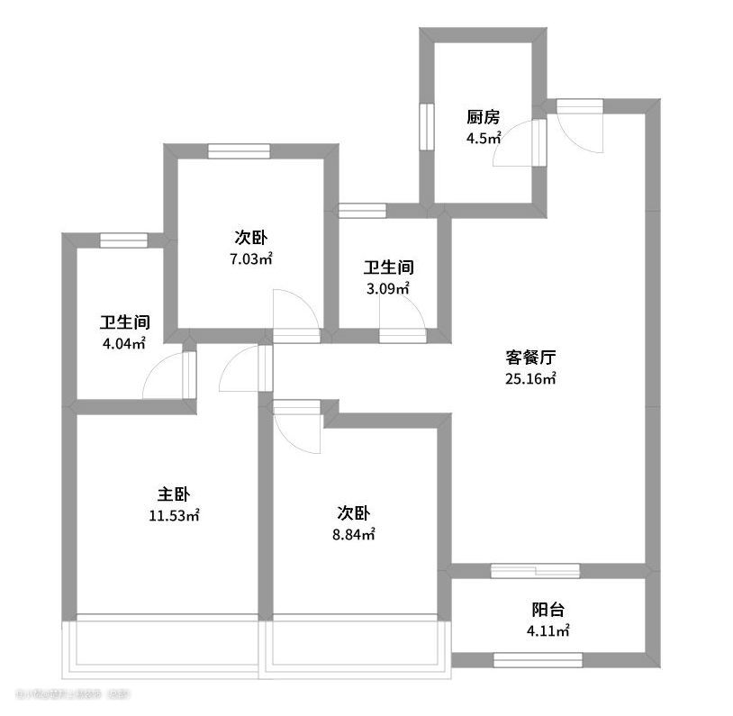 户型属于典型的三室两厅两卫的户型,满足大部分的三口之家需求。 户型优点:1.空间规划合理,2.朝向南北朝向,采光利用得当;3.过道没有存在浪费空间;4.楼间距满足改善性住房需求,塔板结构房屋居住舒适。 户型缺点:1.虽然空间规划合理,但面积不大,储物空间规划设计上问题偏多;2.客餐厅虽为两厅,但进户后过于宽广,没有很好的功能结构,需要进行客餐分离且不能影响到户型的视觉宽大感。 设计思路:1.进行色调确定,小户型设计去繁从简利用原始结构让房间呈现完整性;2.轻装修重装饰,基础装修上选择性价比较高材料来为基础设计做好基建避免后期施工上出现问题,整体效果靠软装搭配呈现。