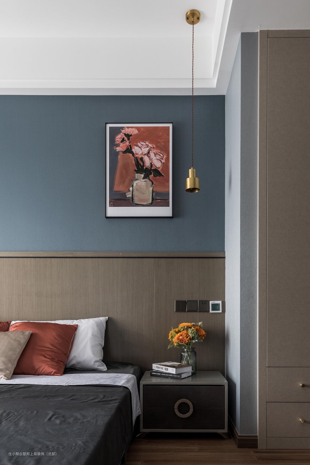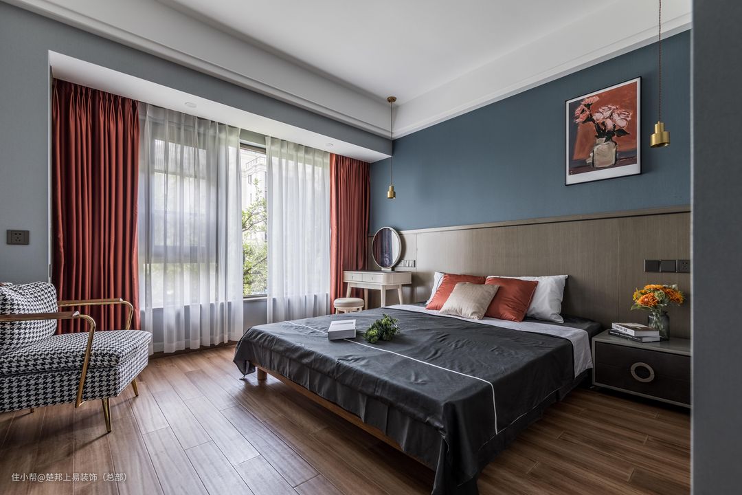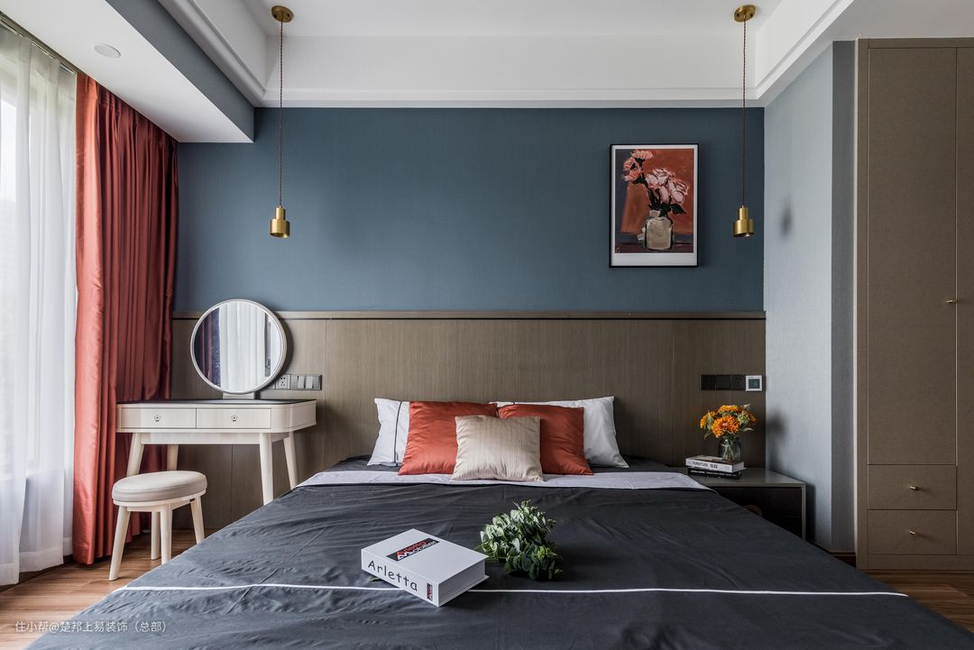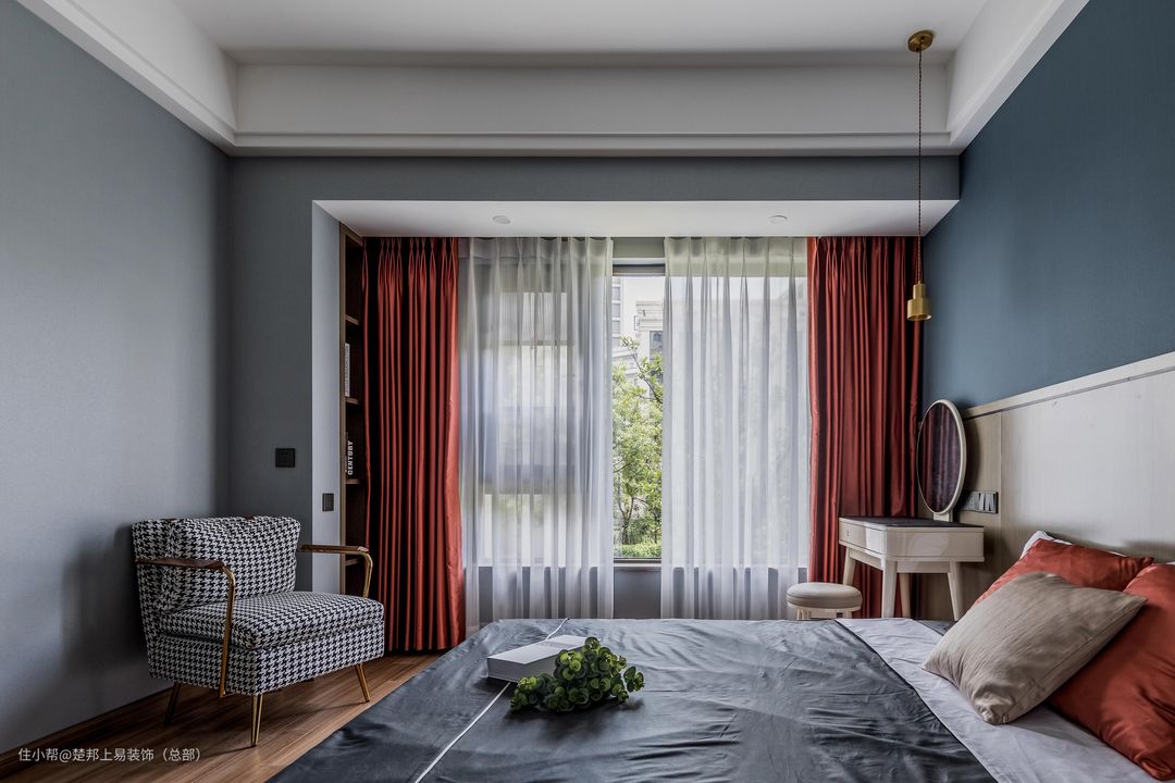 主卧的墙面涂刷更加符合卧室空间的功能性的雾霾蓝搭配西瓜红窗帘,两种颜色一个热烈一个安静,相得益彰。让在简单的空间里也有不一样的“精彩”。