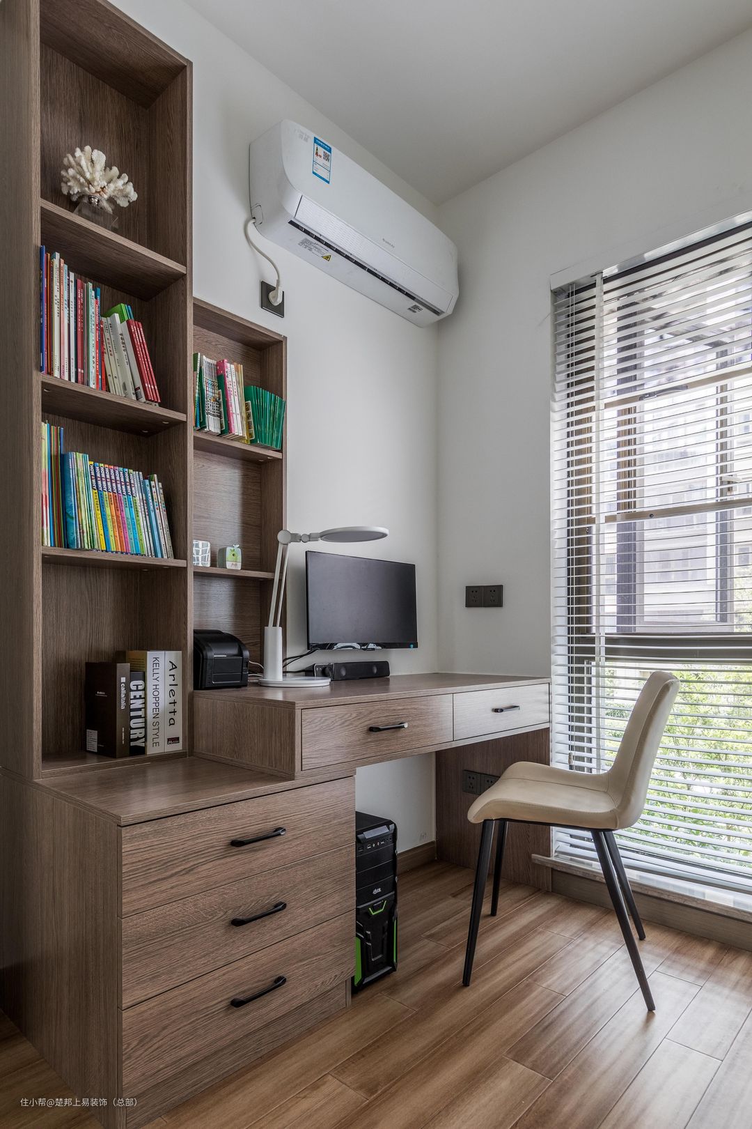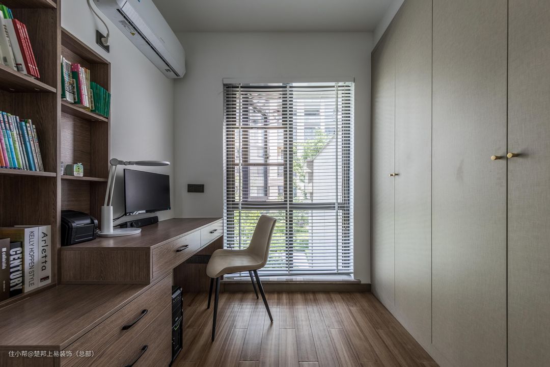 书柜是入墙式的,极大的利用了空间,为了增加储物空间,将书柜对面一侧的整面墙都制成了衣柜,看起来十分规整好看。