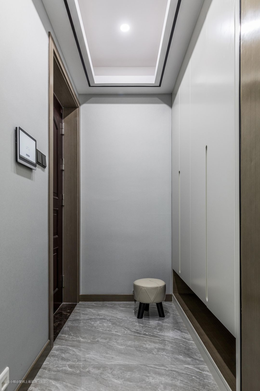 入户玄关柜设计考虑角度出发点为储物的实用性和基础装修的简单感。因此做通顶柜子,避免顶部落灰同时增加储物功能,衣柜面板选择双饰面板作为基础材料与全屋色调统一显得干净简单,让人进入房间第一眼觉得“房子是来住的,不是单纯好看的”落地完整感。详细的尺寸内部结合设计师的节点大样图有更明确的生活功能规划。