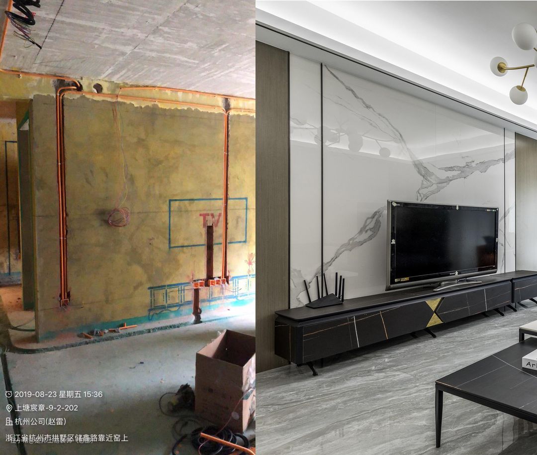 电视背景墙为石材整体效果,需要开槽走电,交底后电视墙开槽拍照预留,避免后期检修出现问题。