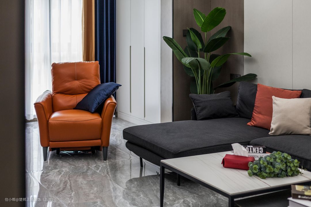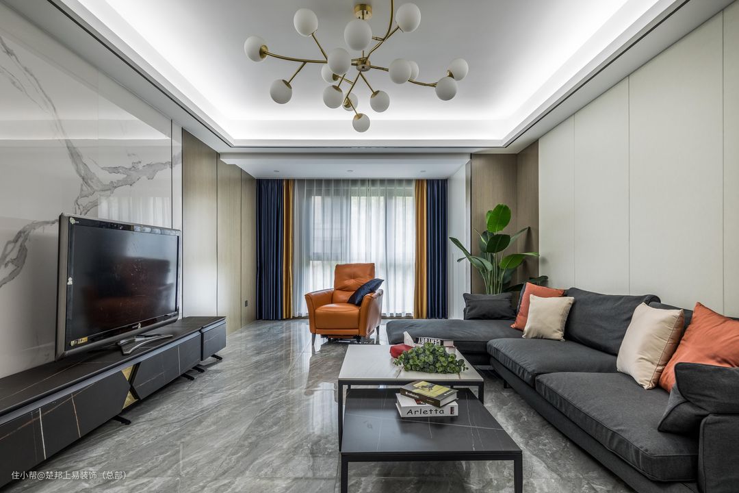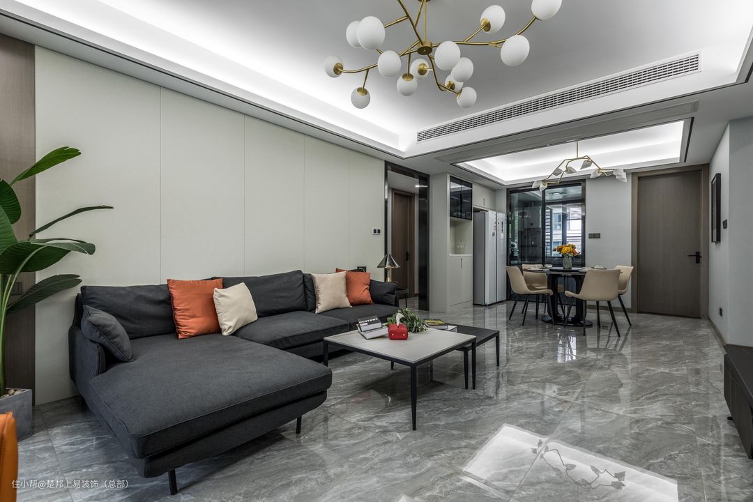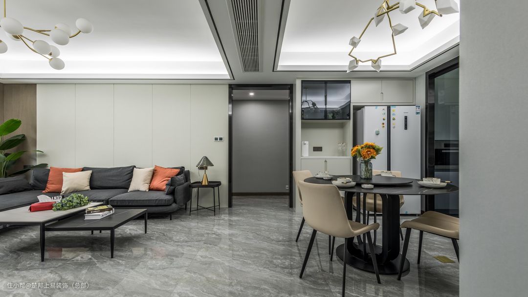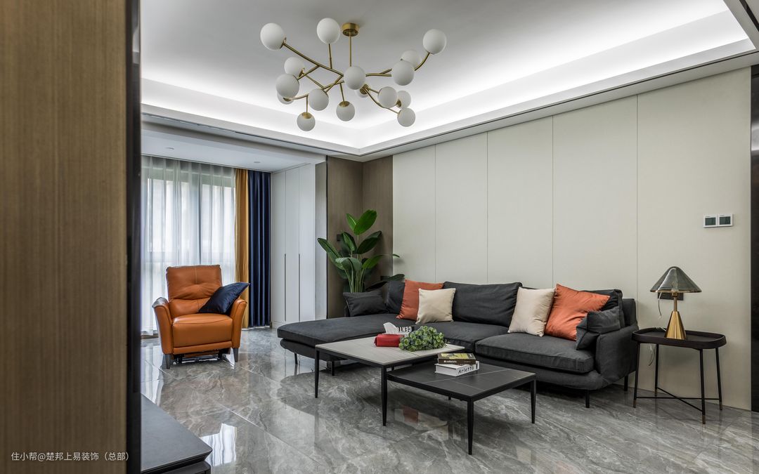 沙发背景墙选择正常硬包,搭配L型沙发设计,在满是重点的房间设计内有种慵懒的邂逅感,每个客厅的设计应该留出一个空间让人想要去伸展自己的肢体,惬意的起居室才是生活的场景感。同时设计师考虑到家有老人和小孩,因此并没有做无主灯设计,害怕光线不够,搭配常用的轻奢风吊灯,让房间在设计感与实用性上更好做好平衡,印证了那句“适合自己的才是最好的”。