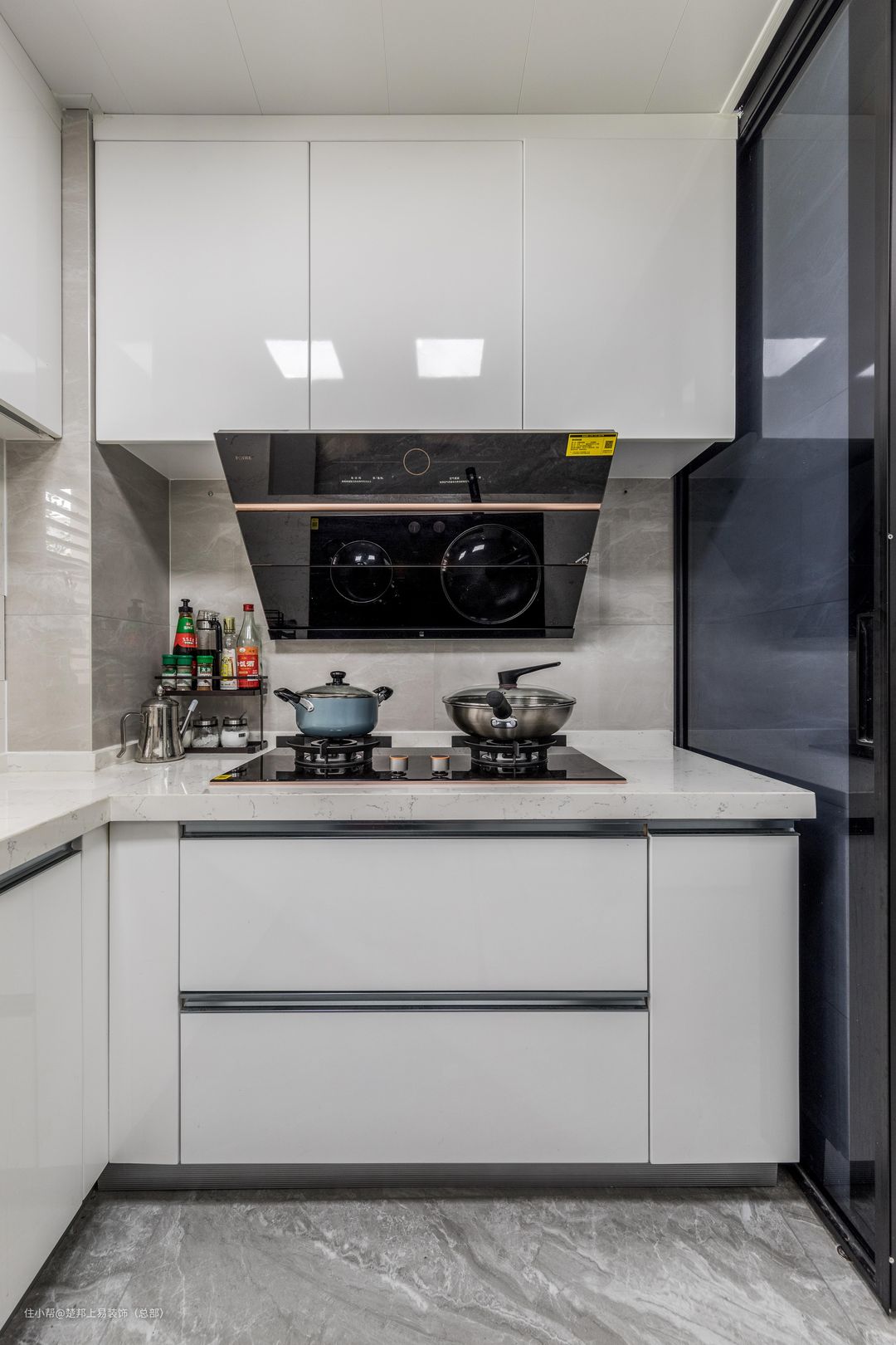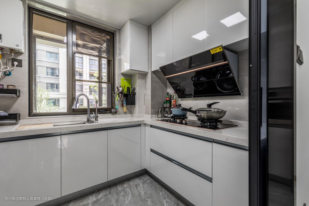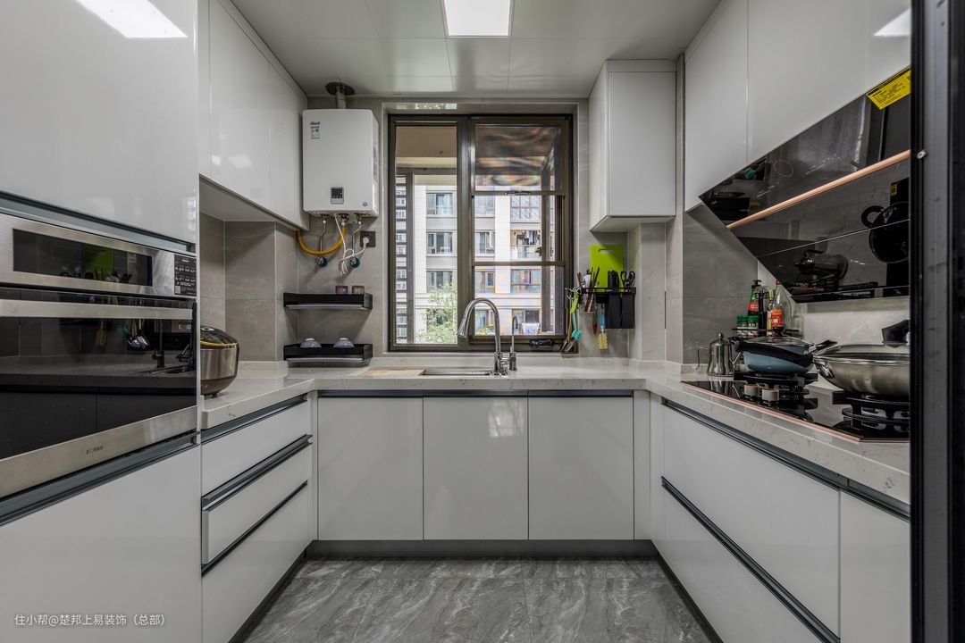 充分利用墙面空间,加设横排吊柜+竖排电器柜,蒸箱、烤箱、洗碗机都可嵌入其中,柜门一关便是整洁一体化的视觉感。