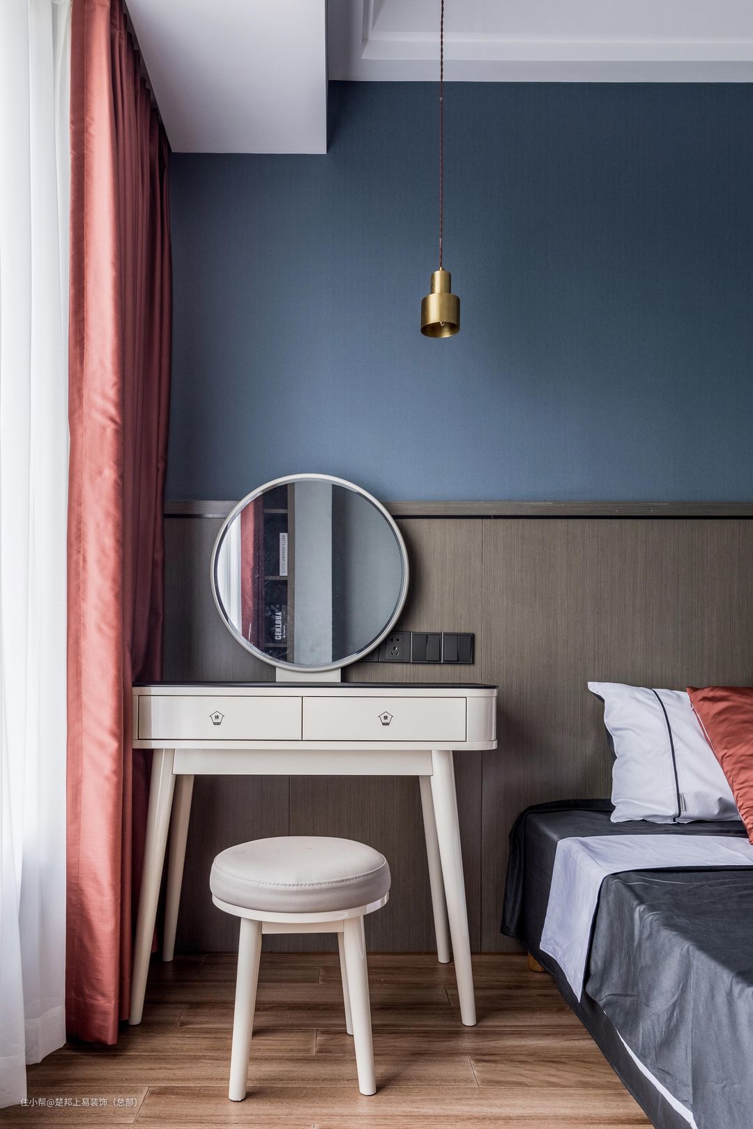 床边是女主人的梳妆台,圆形梳妆镜和小吊顶相互呼应,使空间更具灵动性。