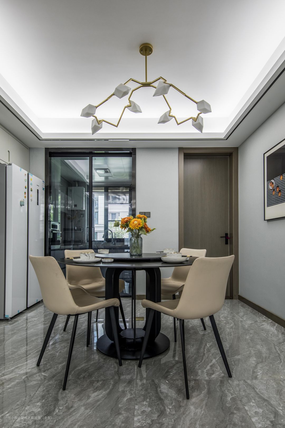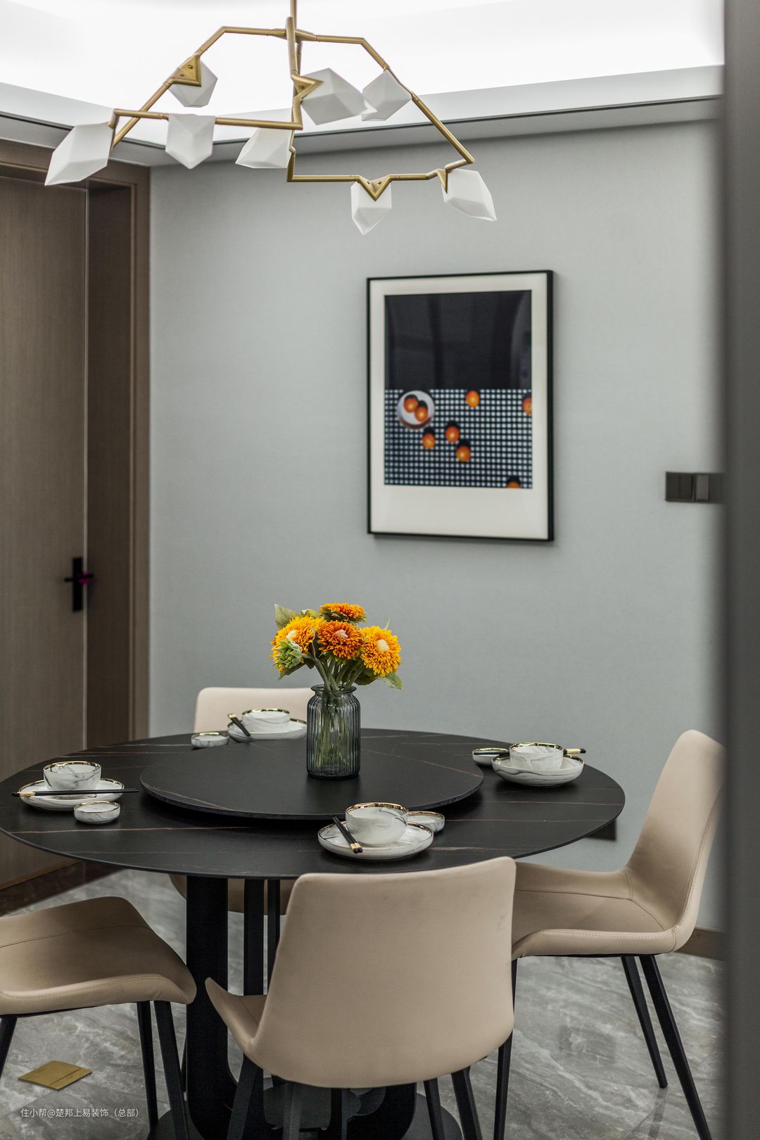 米白色桌椅圈围在一个圆桌上,搭配着树枝桃子吊灯,枝桠上璀璨的金与栀子花般的白,营造出一种简雅华丽的空间氛围。