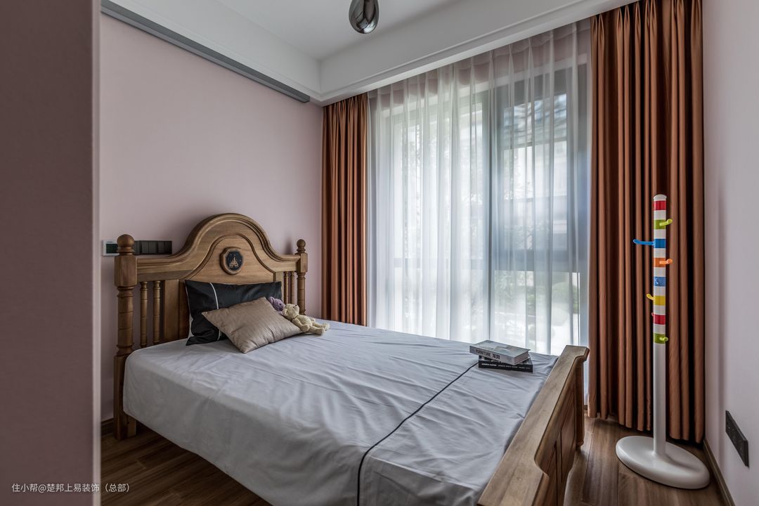 儿童房的床是木制的,很有复古的感觉,给孩子的童话世界的生活场景。旁边为了方便衣物的摆放、树了一个衣架,实用又好看。