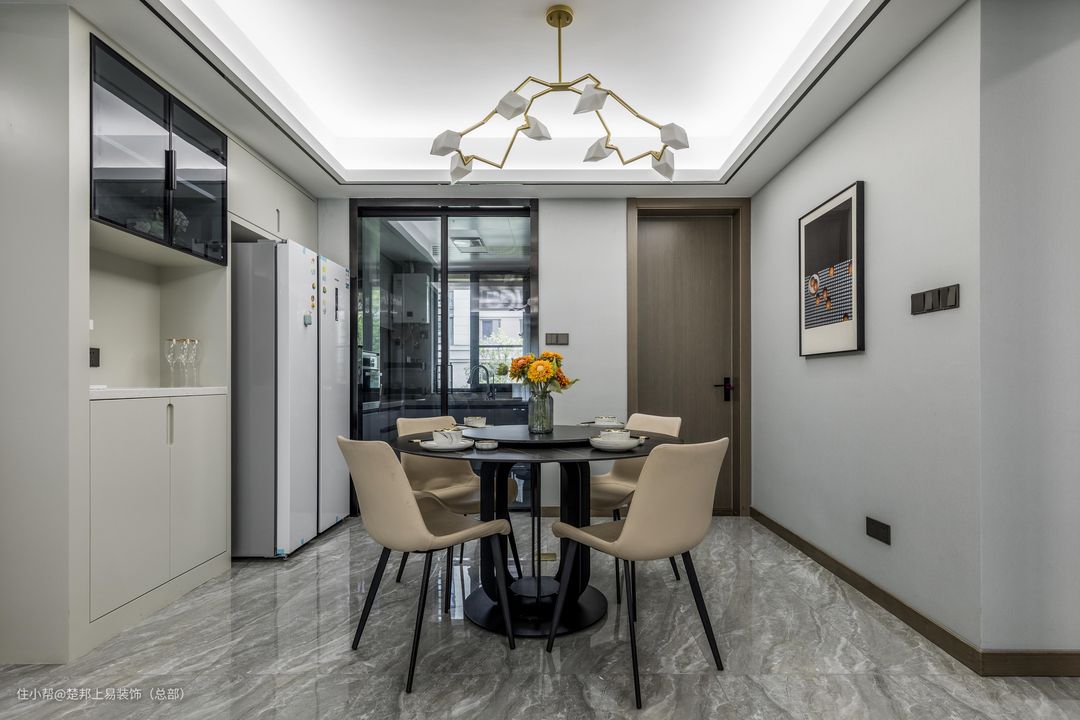 户型空间中的餐厅与客厅是完整一体的,考虑到生活实用和设计的整体性,因此在吊灯的选择上选择同色系的灯具,同时餐边柜的设计也不是落灰性的无脑设计,与家人生活画面贴合到位,餐桌餐椅的挑选上也以整个设计思路贯穿到位,不要到处是重点,设计要学会留白。
