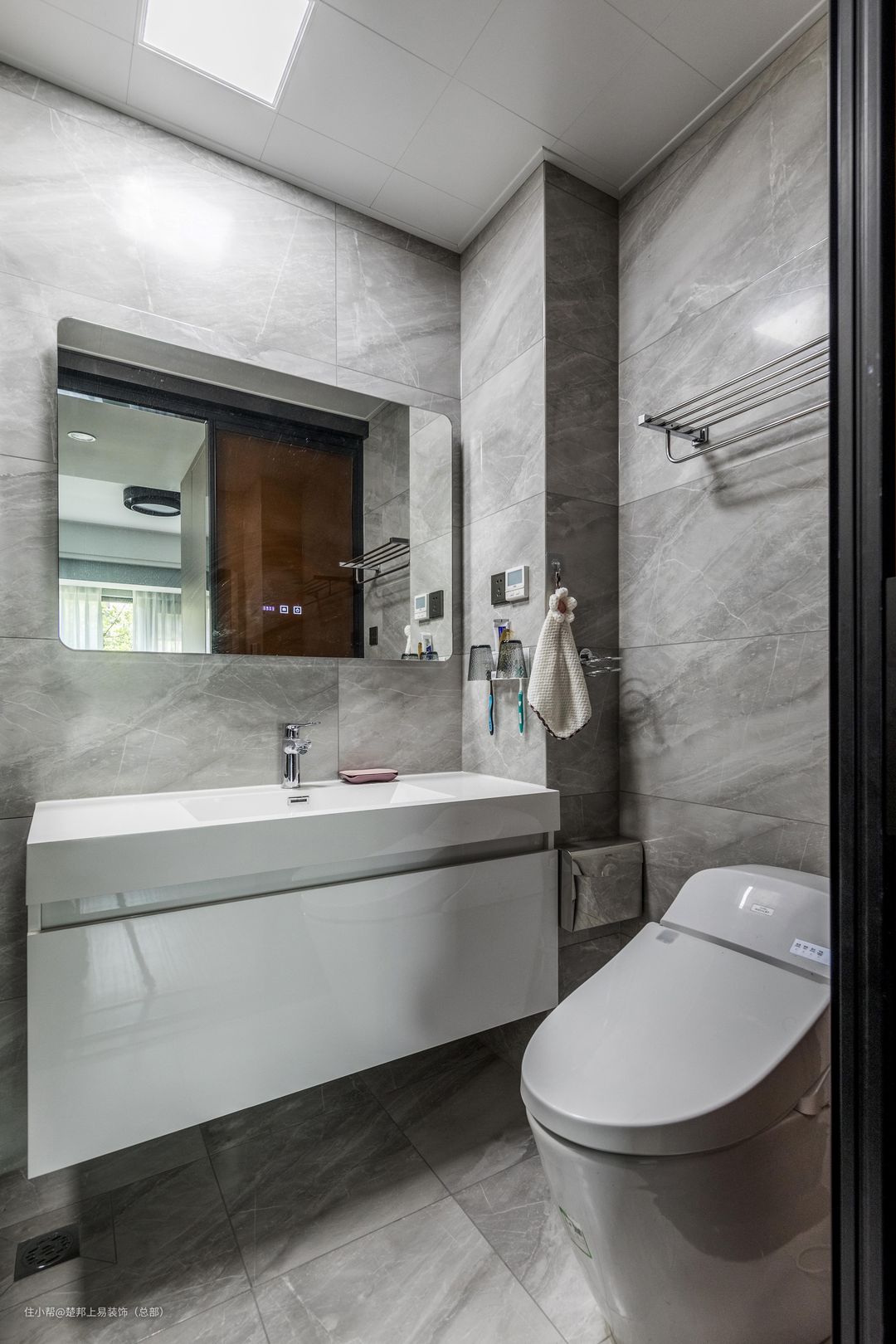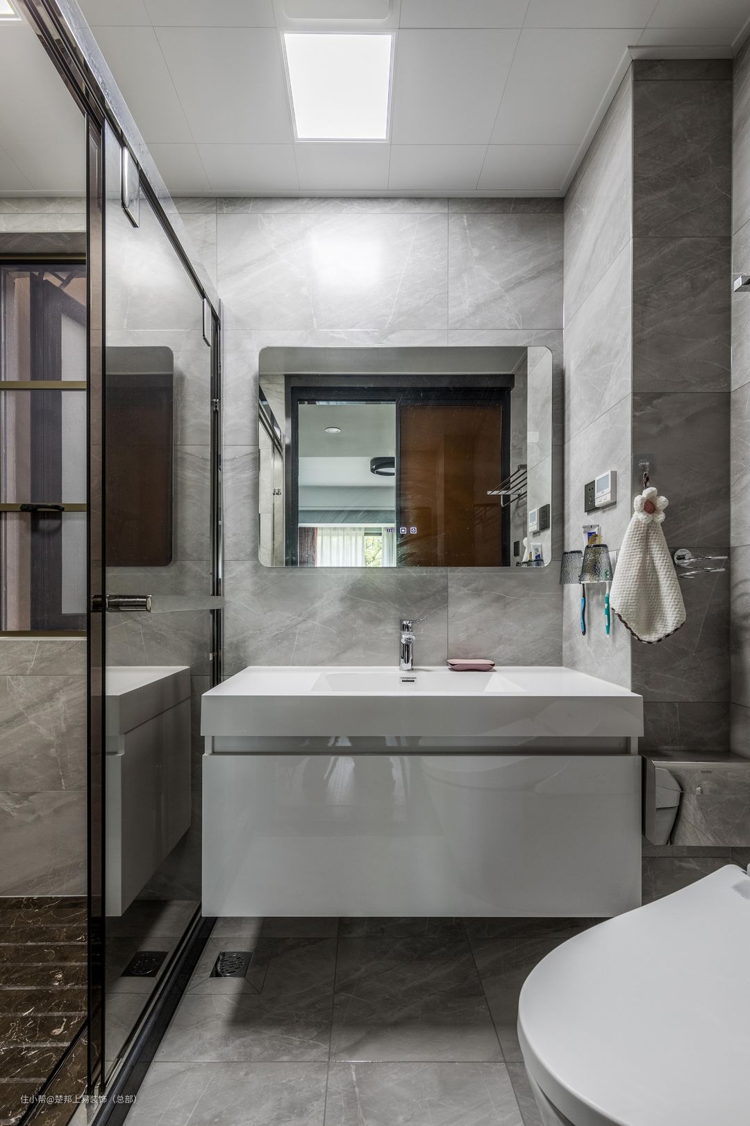 卫生间考虑到使用人较多,因此从设计开始时候便选择较为方便打扫的悬空浴室柜,不用每次打扫时候都有卫生死角。下水的干区做回字形套割工艺,再也不用担心下水堵塞。