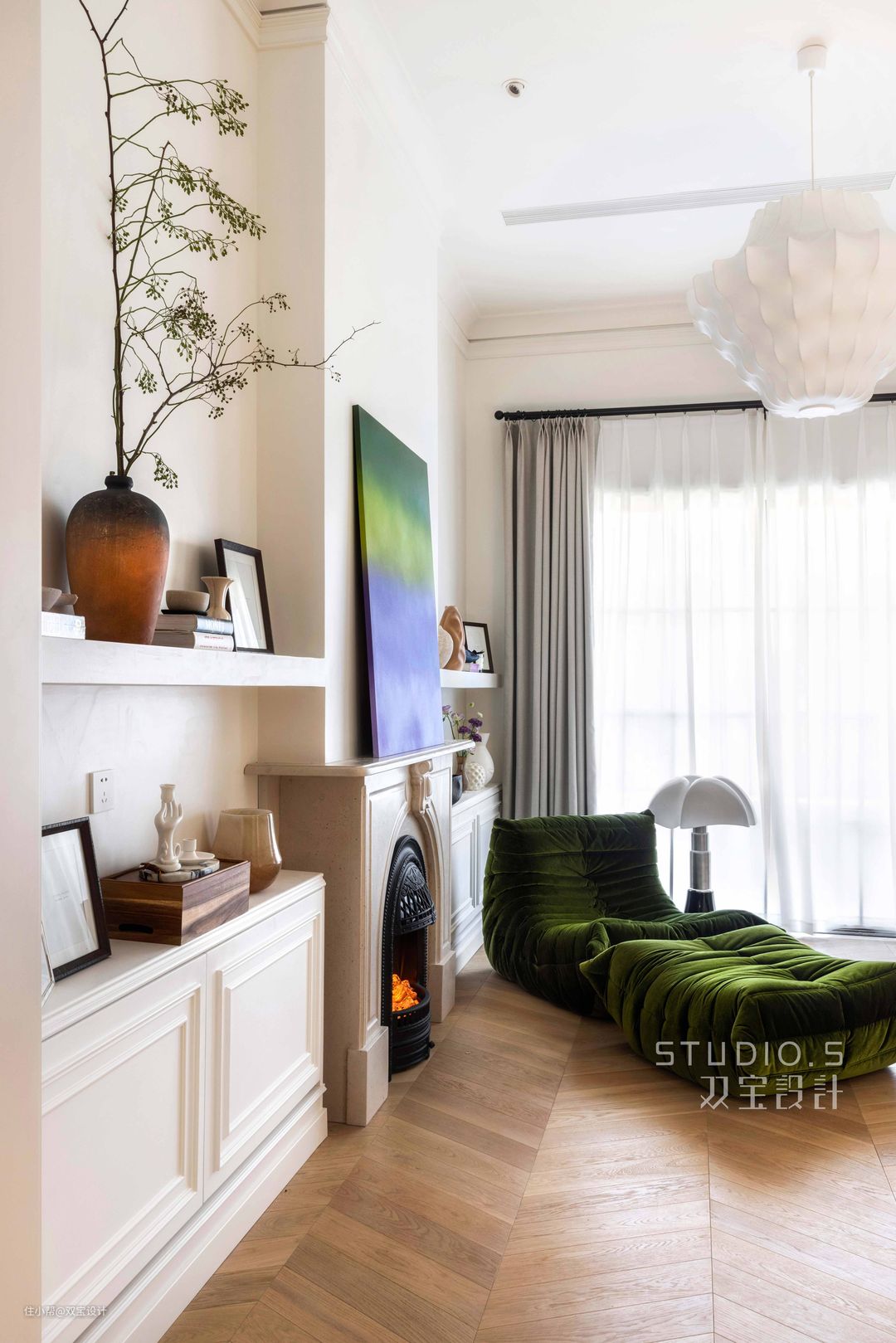 鱼骨拼木地板延伸至室内,卧室延续公共区域的沙灰白主调,饰以葡萄牙米黄大理石壁炉,营造法式的优雅浪漫。绿色Ligne Roset Togo沙发与Liveart装饰画运用大胆撞色手法诉说时间的味道,壁炉两侧采用单层壁龛+装饰柜,壁龛上每一个小物件都拥有与屋主专属的小故事,目睹屋主过去生活中的点点滴滴,也将见证屋主幸福的未来。