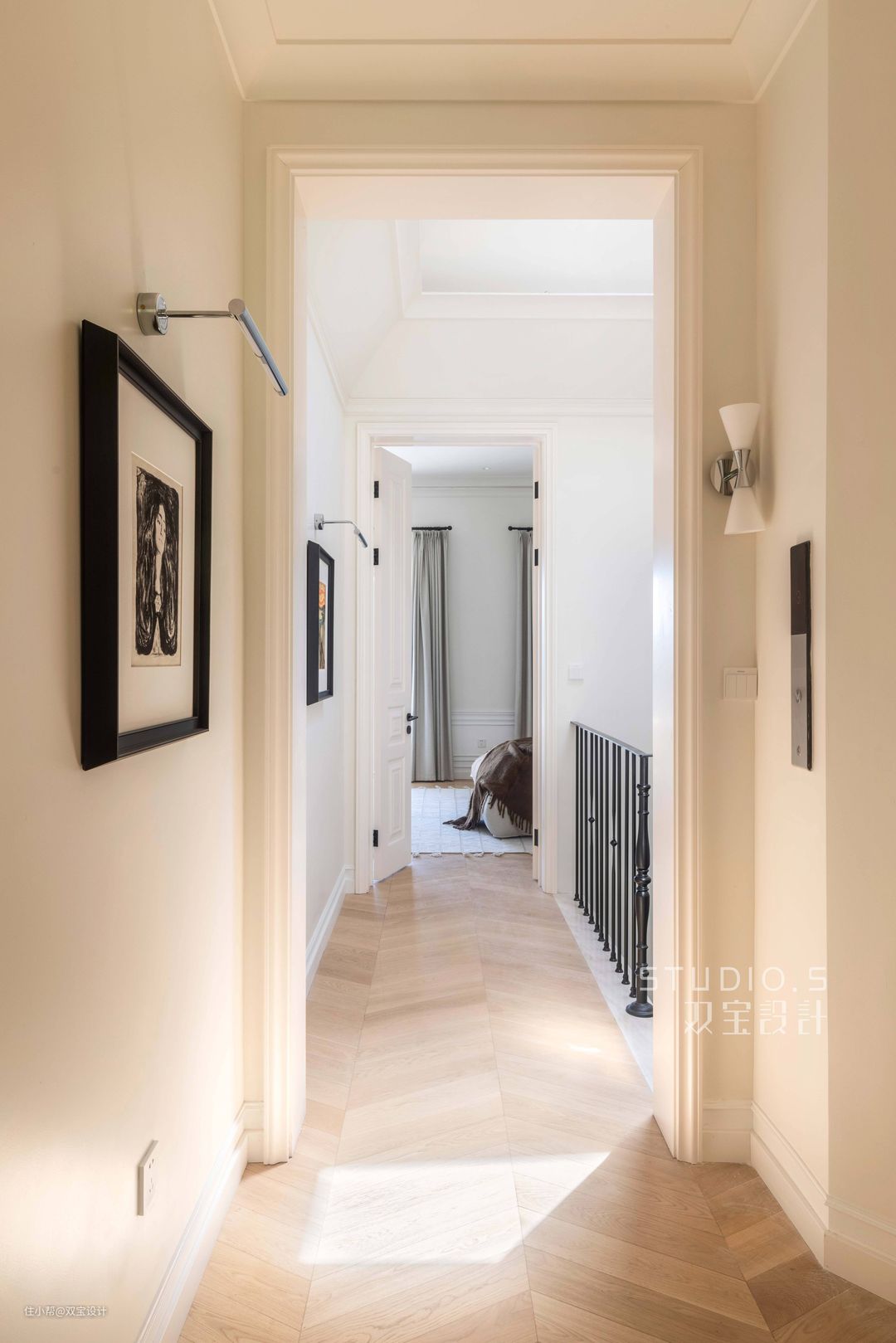 阳光透过天井落在屋主每天必经之路上,通铺的鱼骨拼木地板,视觉上增加延伸感的同时又丰富空间的层次感。细节之处是与墙面统一色调的踢脚线,搭配挂画与壁灯,使得整个过道简约而不简单,给足阳光肆意挥洒的空间。