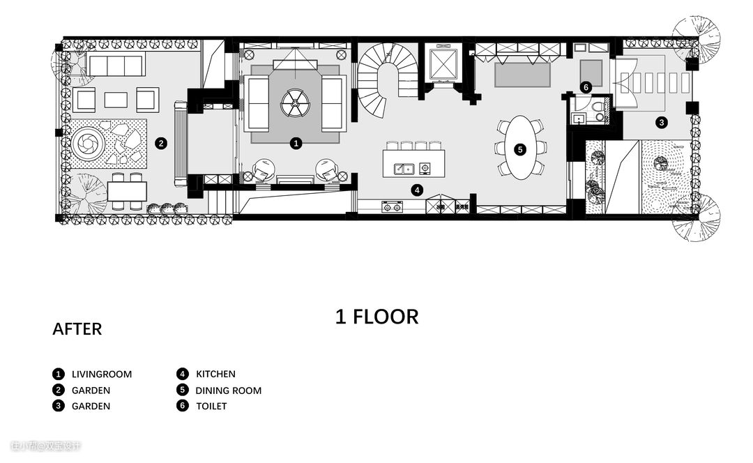 改造亮点: 1.在原本的户型中,三层地面建筑,被一处天井沉闷切割。无论是空间的纵深感还是光线明暗都被天井堵塞、压缩。为了改善这一境况,设计师打通了天井的四壁,以大面积的落地窗将天井围绕。三个天井为各层楼带来了自然光,光影赋予空间灵动感。 2.将传统楼梯改造成具有动人曲线美的法式旋转楼梯,开放式客厅的多重动线设置使得空间更畅通与灵动。 3.餐厨区拥有洄游动线,中岛台处于餐厅通往客厅的动线上,造就了视觉上的风景,也建立了空间的连接感。 4.主卧空间解构重建为卧室+衣帽间+三分离卫生间的套房,增加卧室的空间且保证私密性,步入式衣帽间、淋浴间干湿分离保证使用的舒适感。